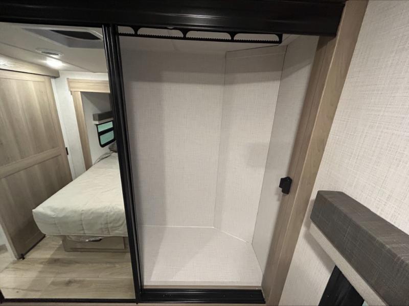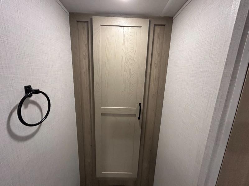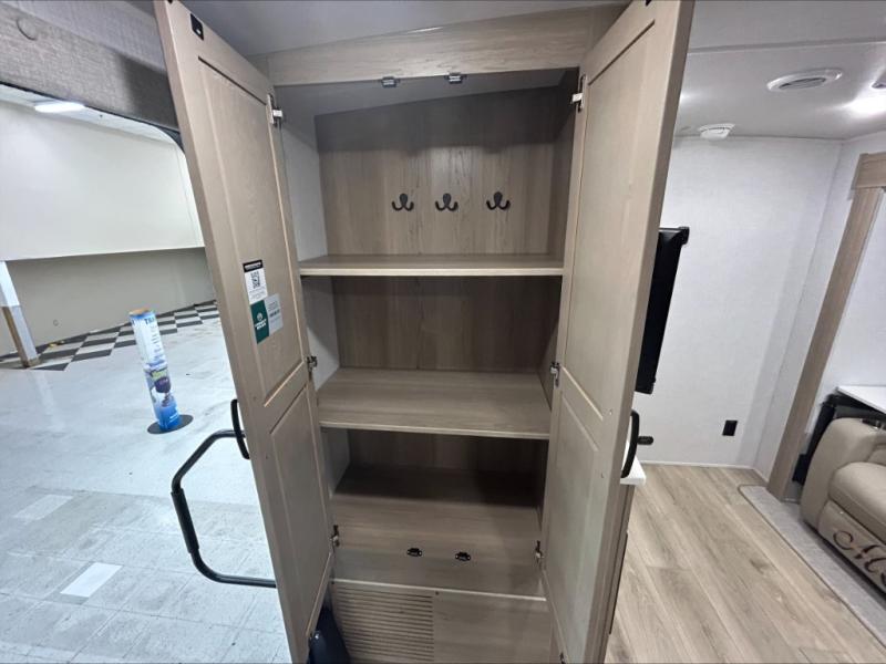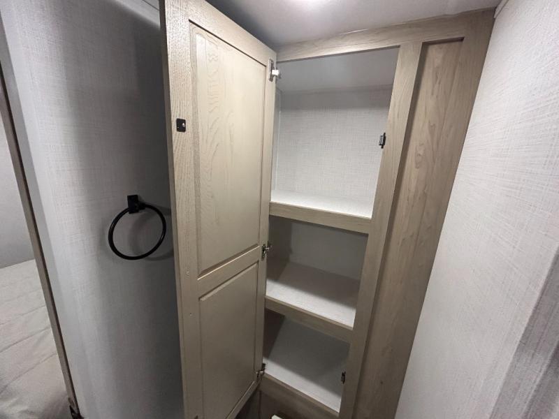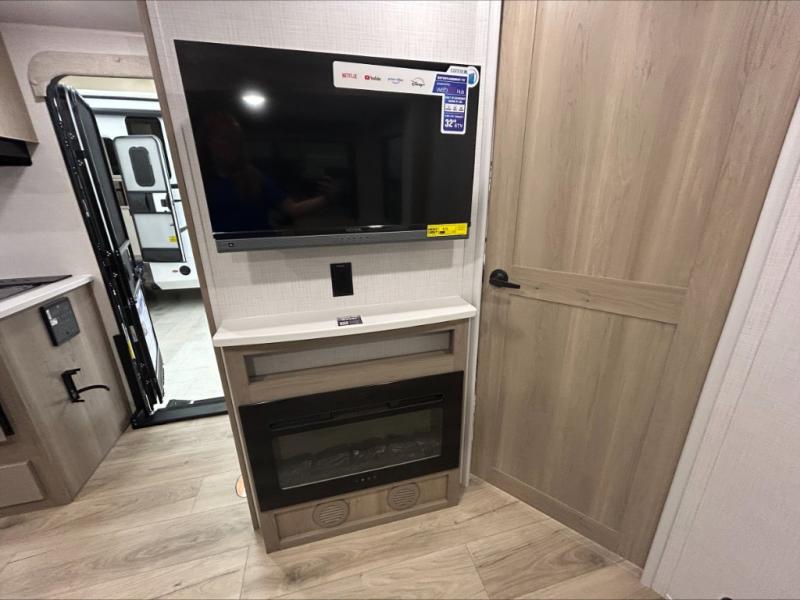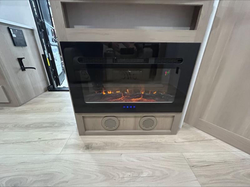 Escape the city life for weekend trips in this cozy couple's trailer. The dual entry doors will allow you to enter in through the rear private bedroom, or the front kitchen/main living area for convenience. You will enjoy relaxing on the theater seating across from the 32" TV and fireplace in the evenings, or you can visit outdoors under the 19' power awning. You'll also find an exterior griddle here for quick meals and exterior storage for the fishing poles or hiking gear. This model also includes a walk-through bath with a shower skylight, a linen closet, plus a Showermiser Water Saving System. And don't worry about storage space inside since this model includes an entryway pantry/closet, a second pantry in the front kitchen, plus a large bedroom wardrobe to keep your clothes wrinkle-free!