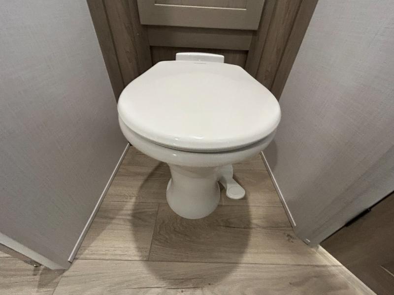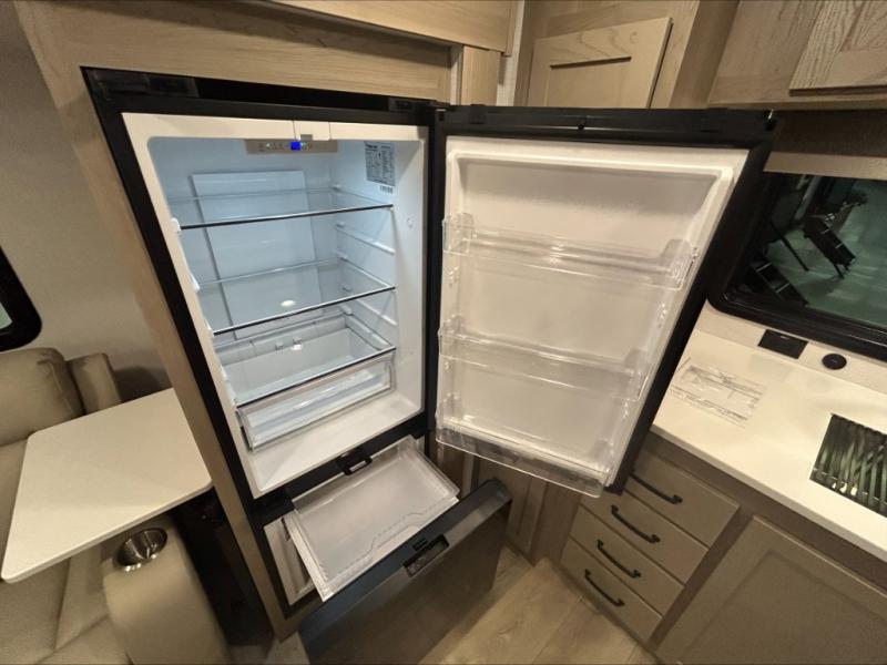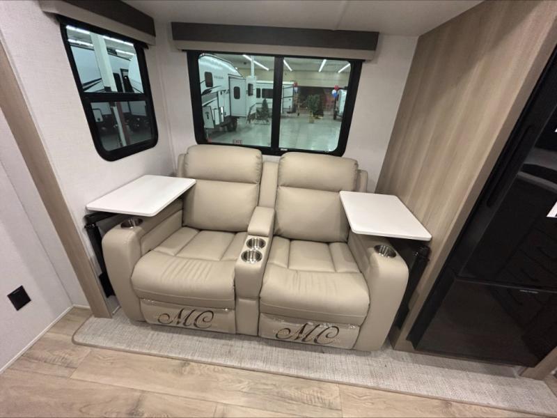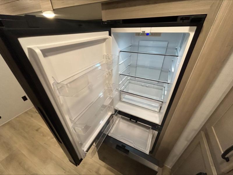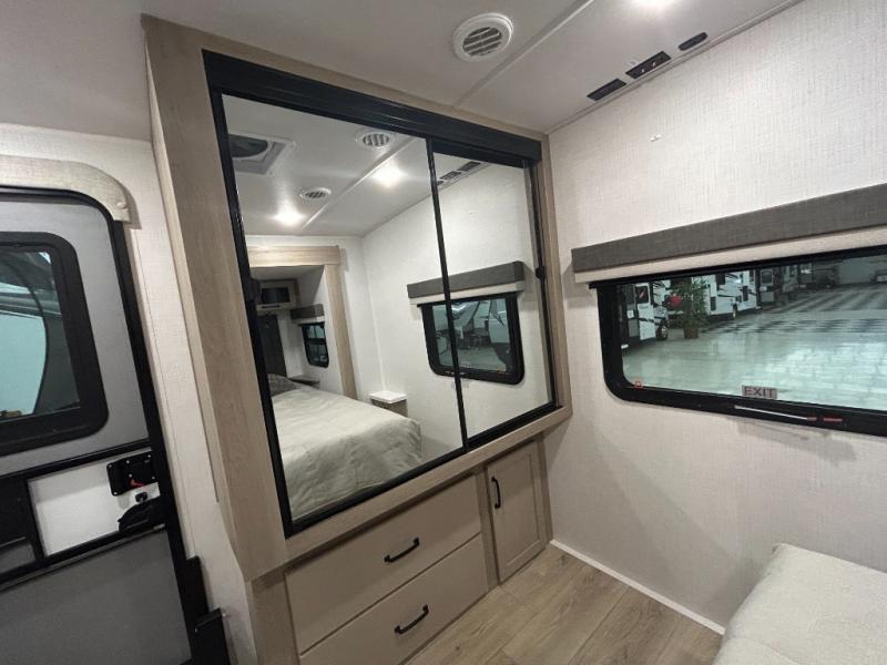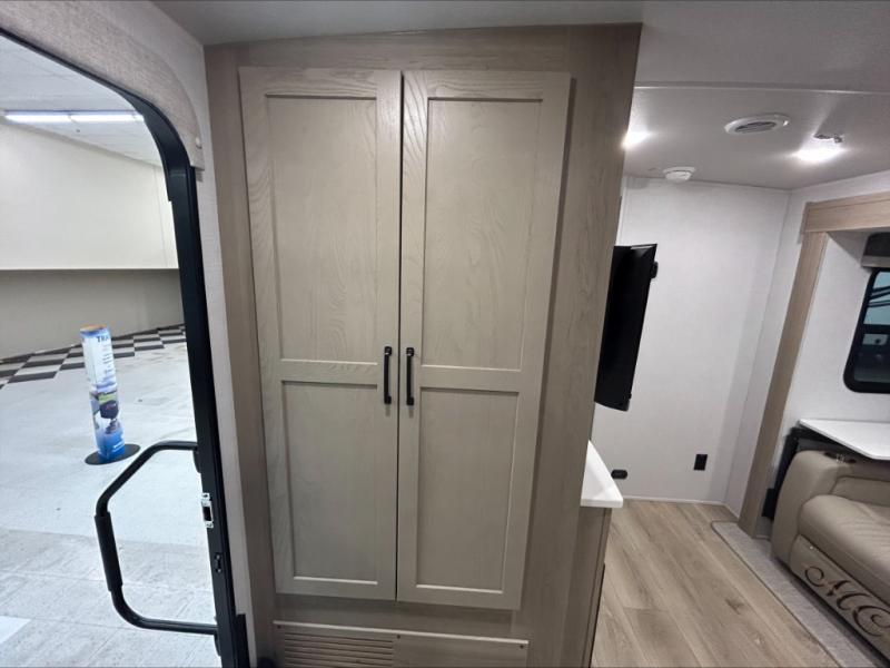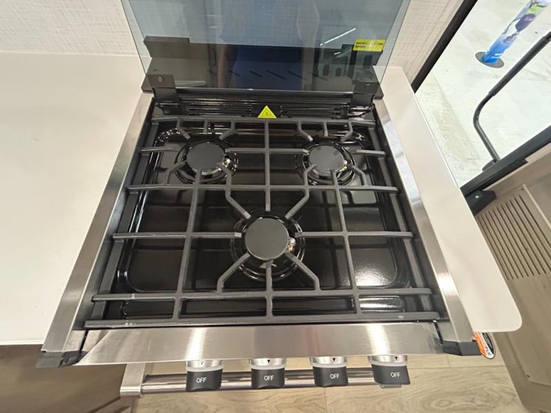 Escape the city life for weekend trips in this cozy couple's trailer. The dual entry doors will allow you to enter in through the rear private bedroom, or the front kitchen/main living area for convenience. You will enjoy relaxing on the theater seating across from the 32" TV and fireplace in the evenings, or you can visit outdoors under the 19' power awning. You'll also find an exterior griddle here for quick meals and exterior storage for the fishing poles or hiking gear. This model also includes a walk-through bath with a shower skylight, a linen closet, plus a Showermiser Water Saving System. And don't worry about storage space inside since this model includes an entryway pantry/closet, a second pantry in the front kitchen, plus a large bedroom wardrobe to keep your clothes wrinkle-free!