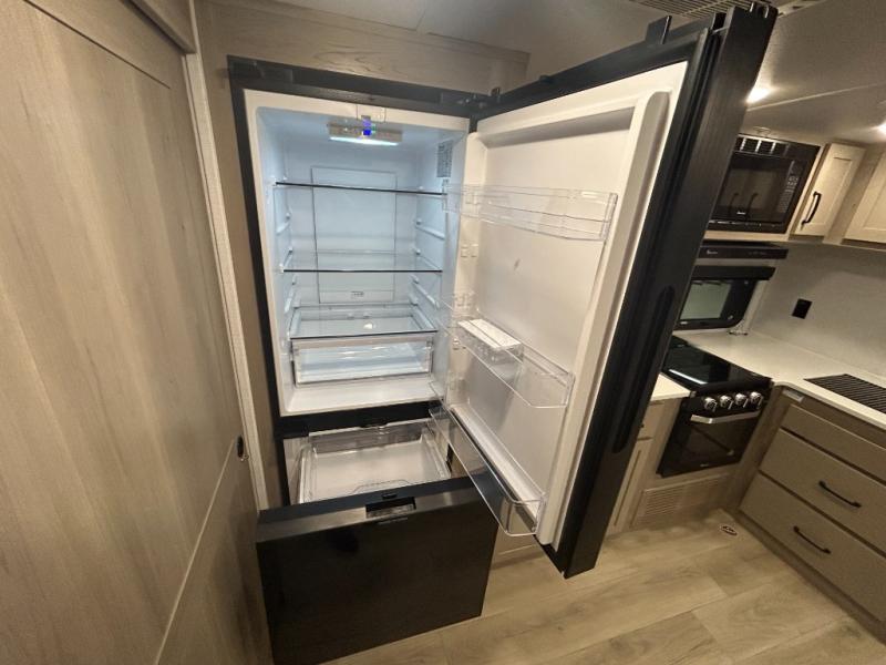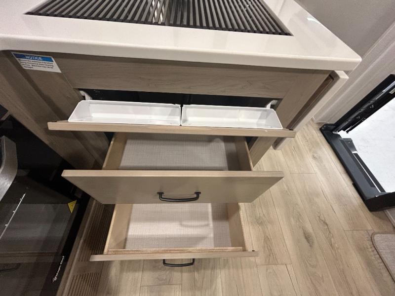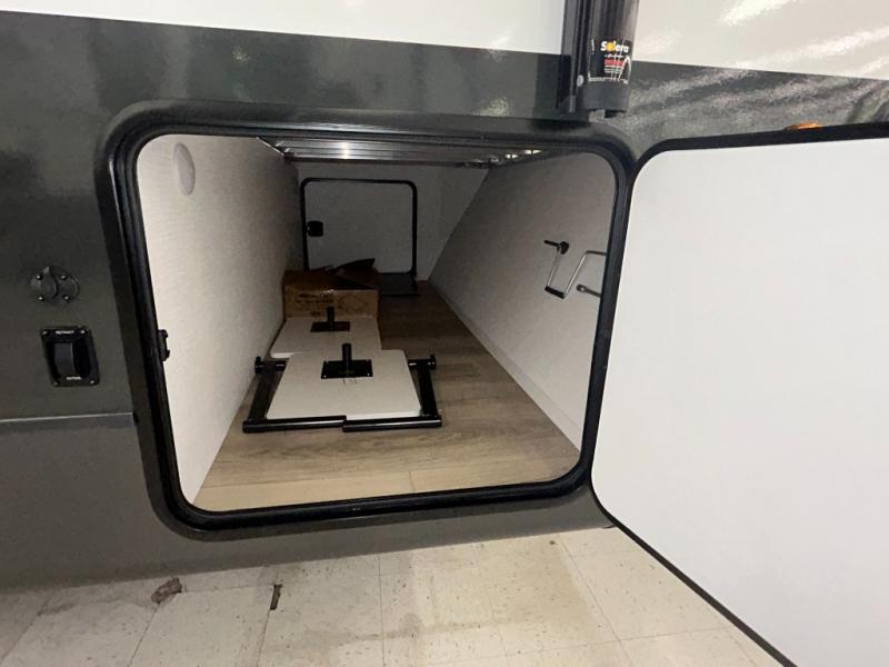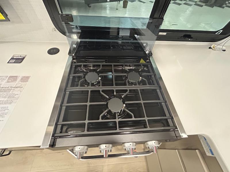 Pick your favorite campground to take this travel trailer to! Once you arrive, unload your gear from the exterior drop-frame pass-through storage, then start lunch on either the exterior griddle or the three burner cooktop inside. If you need a rest after traveling all day, the RV queen bed with flip-up storage in the front bedroom is sure to give you comfort, or you can relax on the 67" theater seating. The entertainment center will make this space feel just like home, and check out the spacious full rear bath for added privacy. This model also includes a 20' power awning to relax underneath rain or shine!