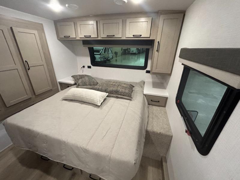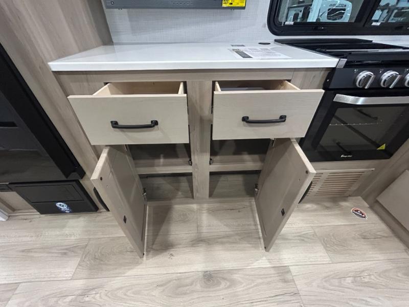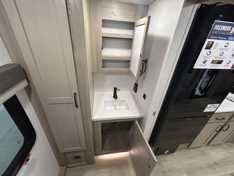 Each Rockwood Mini Lite travel trailer by Forest River is constructed with a fully laminated one-piece walkable roof, sleek frameless windows, and a six-sided full aluminum frame for strength and durability. The 12V thermostatically controlled heated tanks, plus radiant foil in the underbelly and slide out floors will allow you to camp well into the colder months, and the 200W roof solar panel will be perfect for a little off-gridding. Each model includes solid surface kitchen countertops, solid wood cabinet doors, night roller shades, plus many more interior features. Having an AIR 360+ omnidirectional antenna with WiFi prep on board gives you the option to get some work done if it's needed, and the power tongue jack provides hassle-free set up, so you can enjoy more time relaxing!