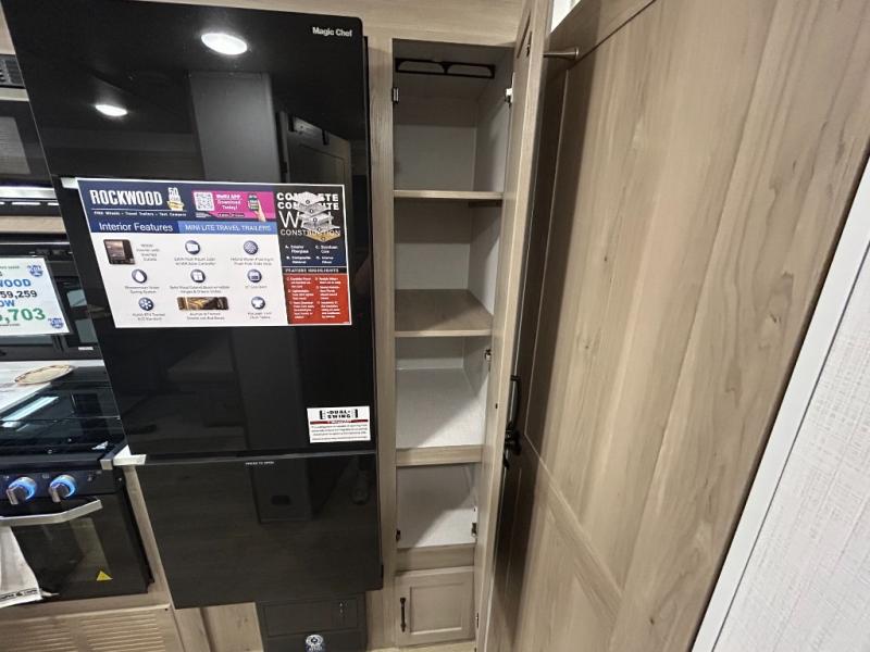 Each Rockwood Mini Lite travel trailer by Forest River is constructed with a fully laminated one-piece walkable roof, sleek frameless windows, and a six-sided full aluminum frame for strength and durability. The 12V thermostatically controlled heated tanks, plus radiant foil in the underbelly and slide out floors will allow you to camp well into the colder months, and the 200W roof solar panel will be perfect for a little off-gridding. Each model includes solid surface kitchen countertops, solid wood cabinet doors, night roller shades, plus many more interior features. Having an AIR 360+ omnidirectional antenna with WiFi prep on board gives you the option to get some work done if it's needed, and the power tongue jack provides hassle-free set up, so you can enjoy more time relaxing!