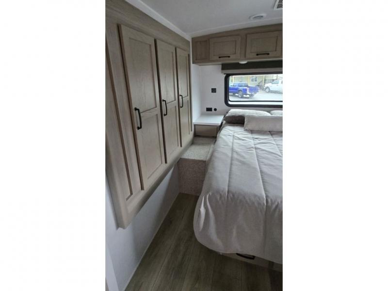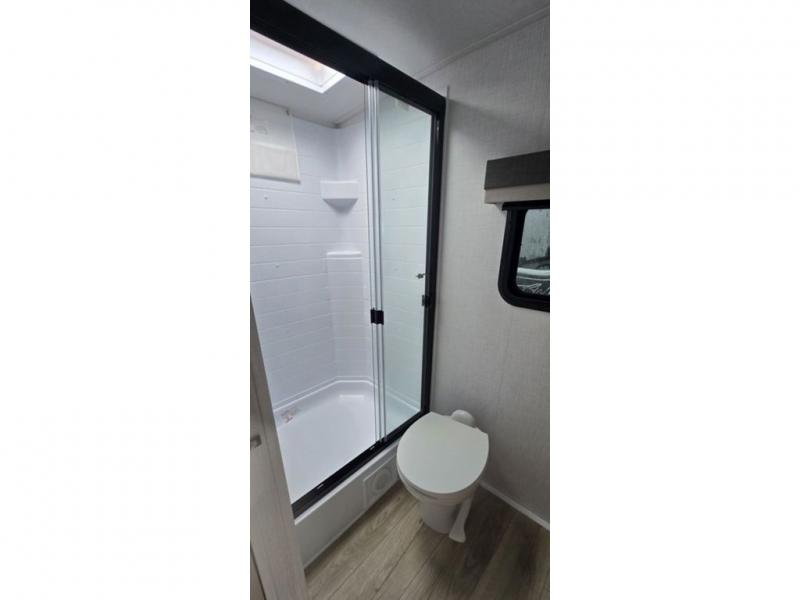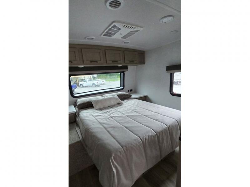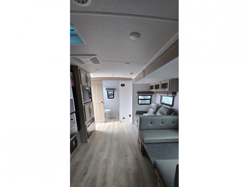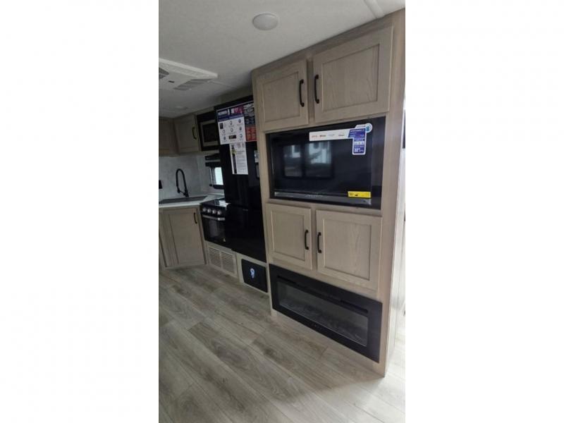 This trailer is the perfect couple's retreat with its private bedroom up front which includes a queen bed, a slide out wardrobe, and a TV option. The spacious rear full bathroom provides a shower and linen storage, and a space savings sliding door. The cook will have full amenities with ample counter space, a walk-in pantry for food storage, and a three burner range to cook meals on. If the weather is nice outside, you can make dinner on the exterior griddle, and there is a 21' awning to relax under. Or you can stay inside to enjoy the fireplace and Smart TV! You will also appreciate the pass thru storage with an optional steel sliding tray to easily access gear!
