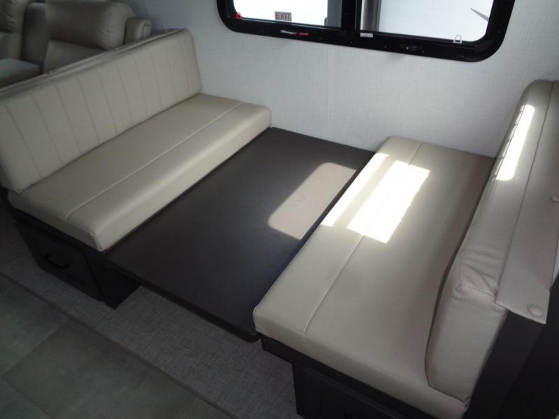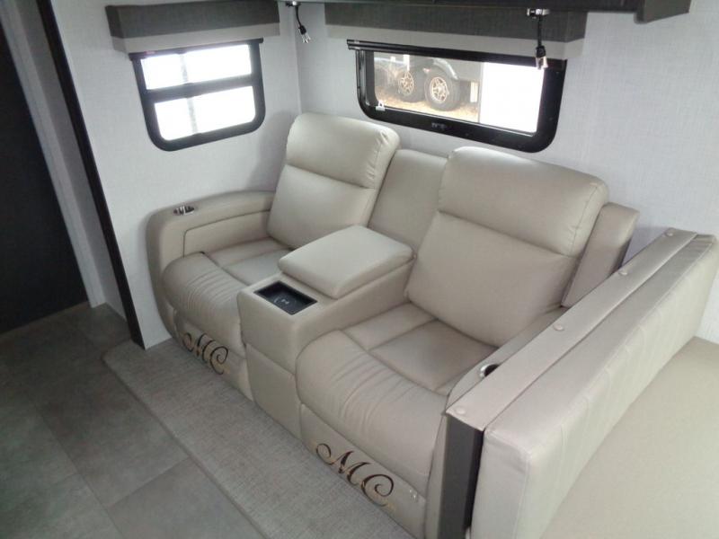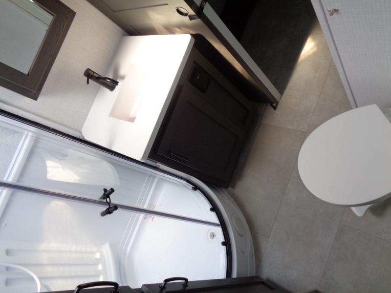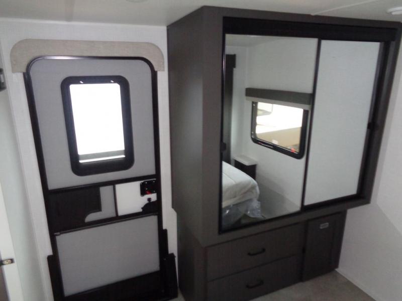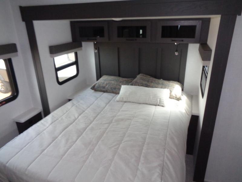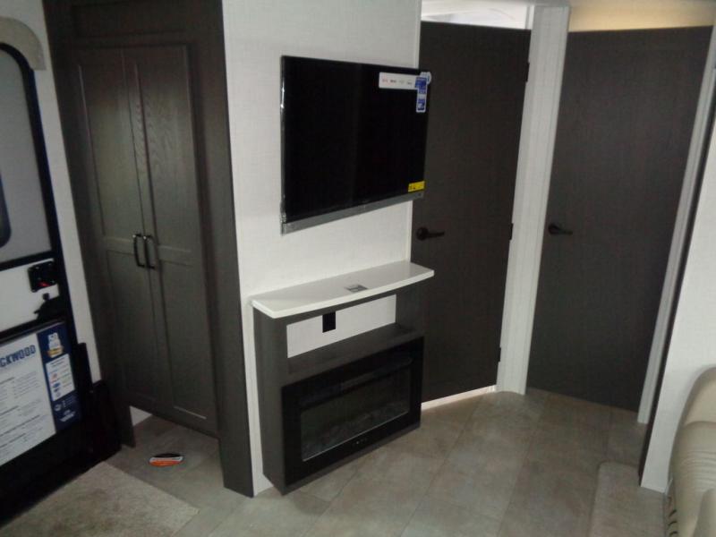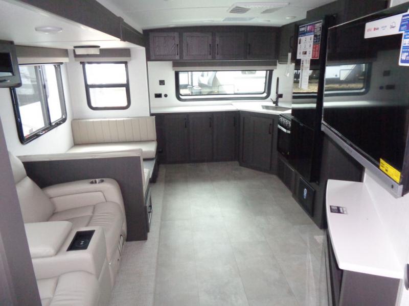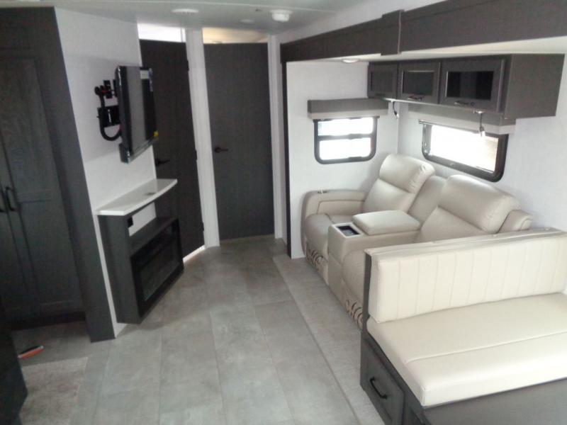 When you are outside this trailer you can enjoy the protection from the 21' power awning, and whip up a meal using the outside griddle. You will find exterior storage for your extra gear, and a ladder at the rear. You get to choose which entrance to step up into, be it the spacious rear bedroom with a queen bed slide and a wardrobe, or the main entry into the kitchen and living area. The furniture slide includes a booth dinette to eat your meals at, and theater seating to watch the Smart TV with a fireplace below. And the cook will love the front kitchen with extra counter space, a three burner range, plus a 12V refrigerator and pantry for food storage!