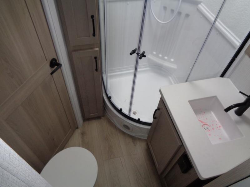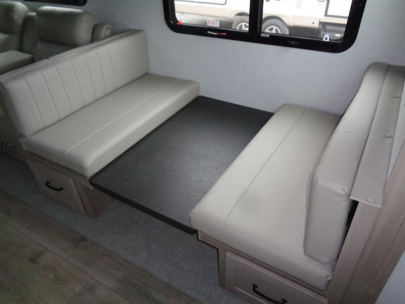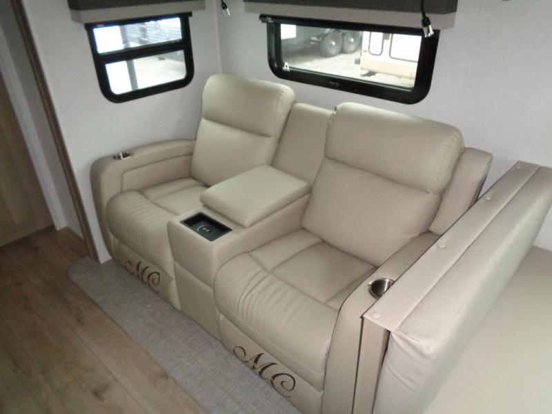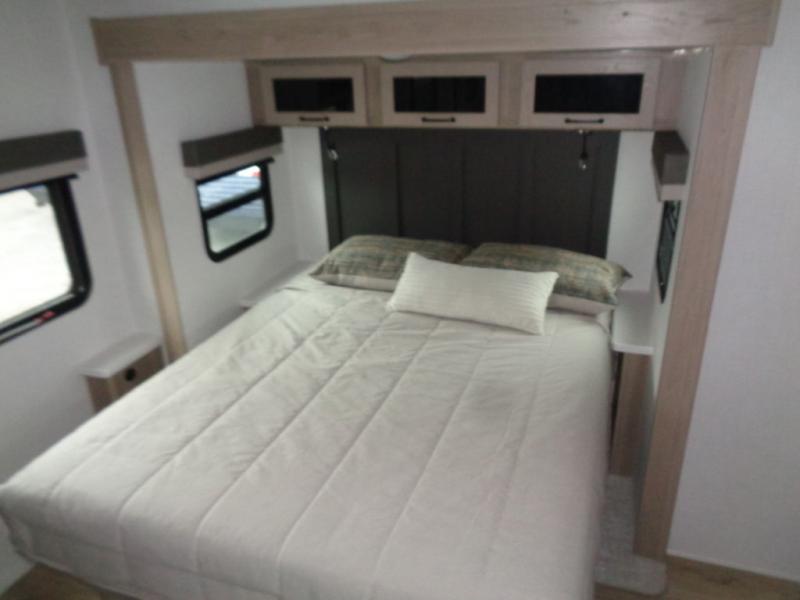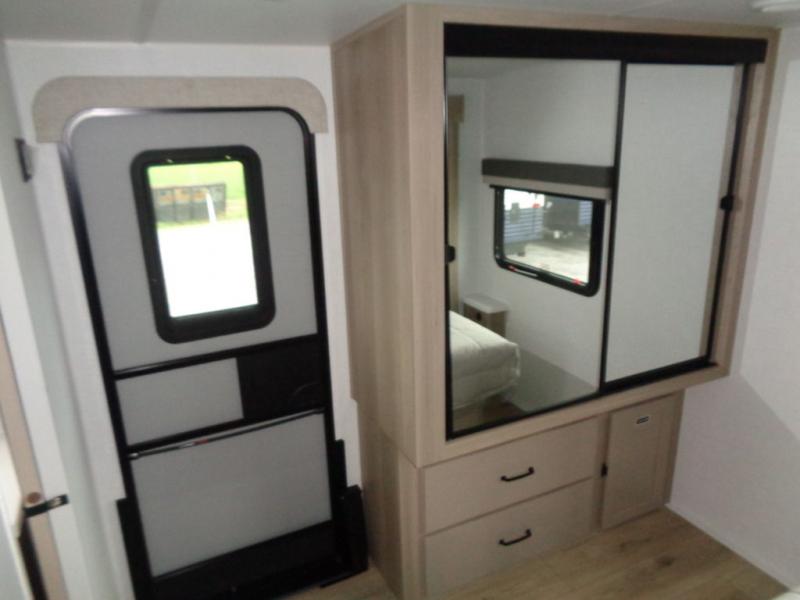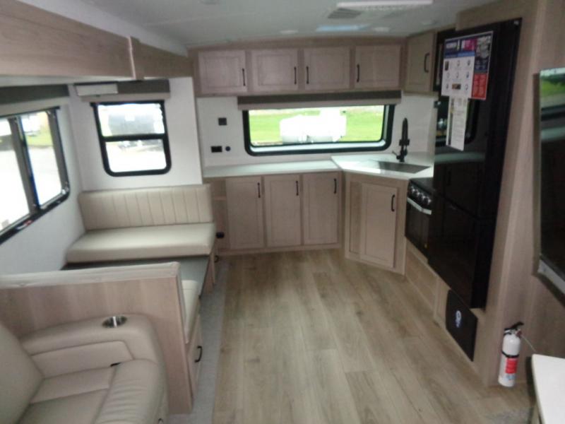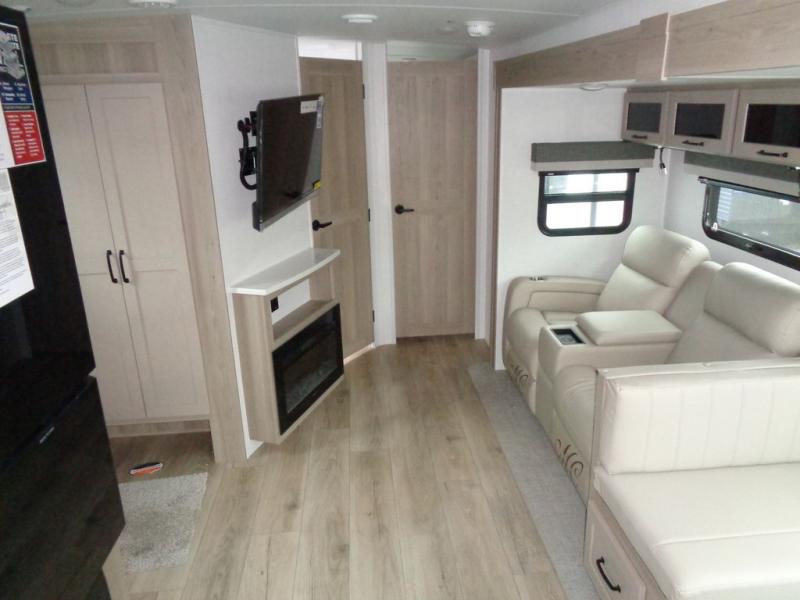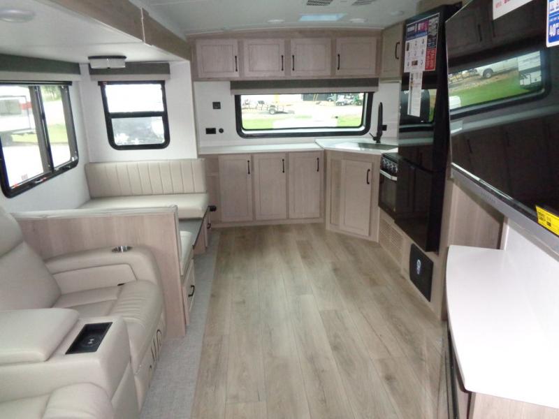 When you are outside this trailer you can enjoy the protection from the 21' power awning, and whip up a meal using the outside griddle. You will find exterior storage for your extra gear, and a ladder at the rear. You get to choose which entrance to step up into, be it the spacious rear bedroom with a queen bed slide and a wardrobe, or the main entry into the kitchen and living area. The furniture slide includes a booth dinette to eat your meals at, and theater seating to watch the Smart TV with a fireplace below. And the cook will love the front kitchen with extra counter space, a three burner range, plus a 12V refrigerator and pantry for food storage!