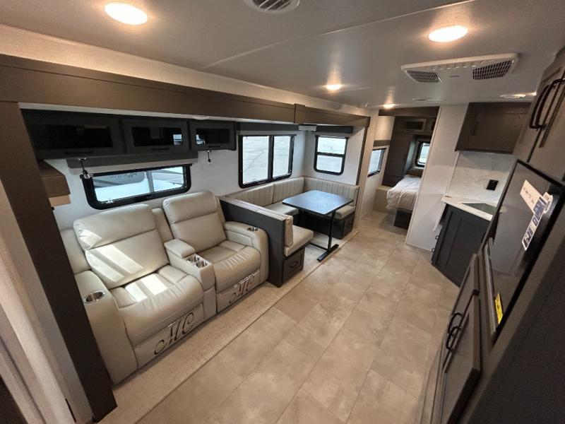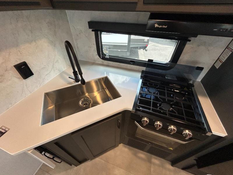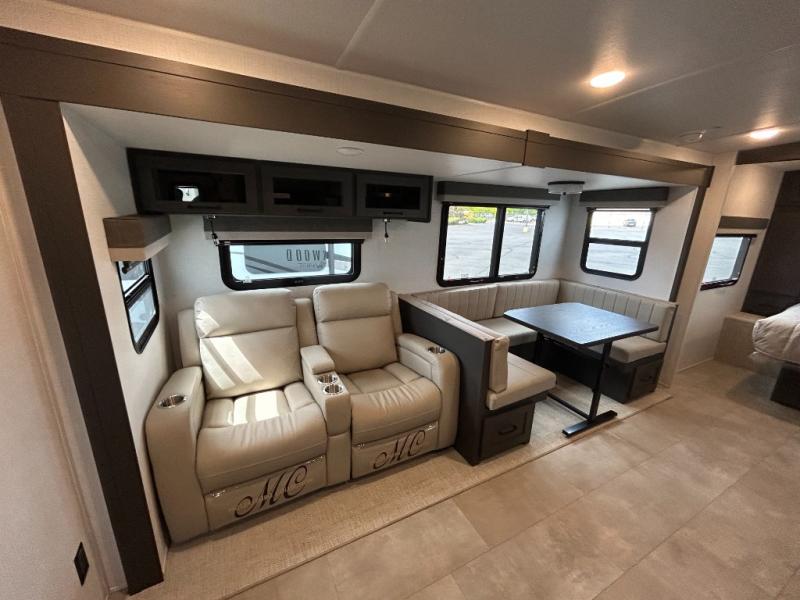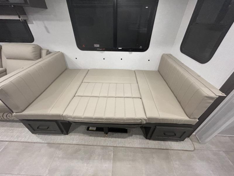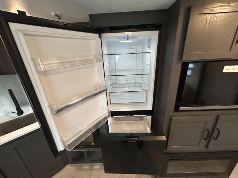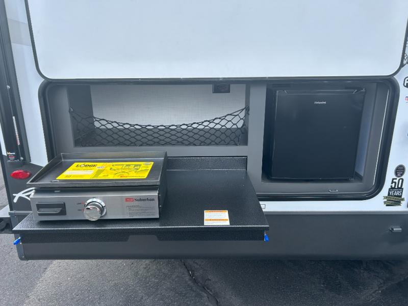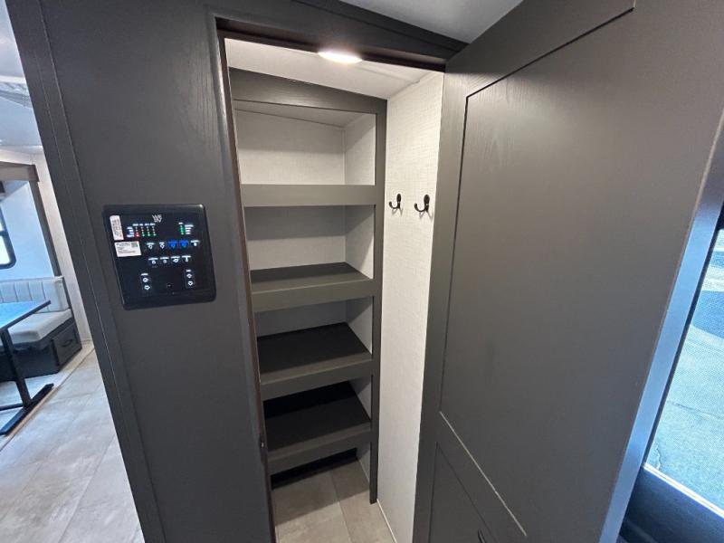 Looking for a trailer that sleeps eight, allows you to cook indoors or outdoors, and provides added interior space? This trailer provides for those wants and needs, and even more! The outside kitchen gives you more choices when feeding the masses along with the outside griddle, and the interior kitchen includes an L-shaped area for the cook to have their own space with full amenities including a walk-in pantry to bring along everything they need. The full bathroom will keep everyone refreshed, and the theater seating and U-shaped dinette offer seating inside to enjoy the Smart TV and fireplace. There is plenty of storage found throughout the interior, and along the exterior you will find several places to stow your outdoor items including in the pass thru storage with an optional steel sliding tray. There is even a front door option if you prefer to have dual entry doors!
