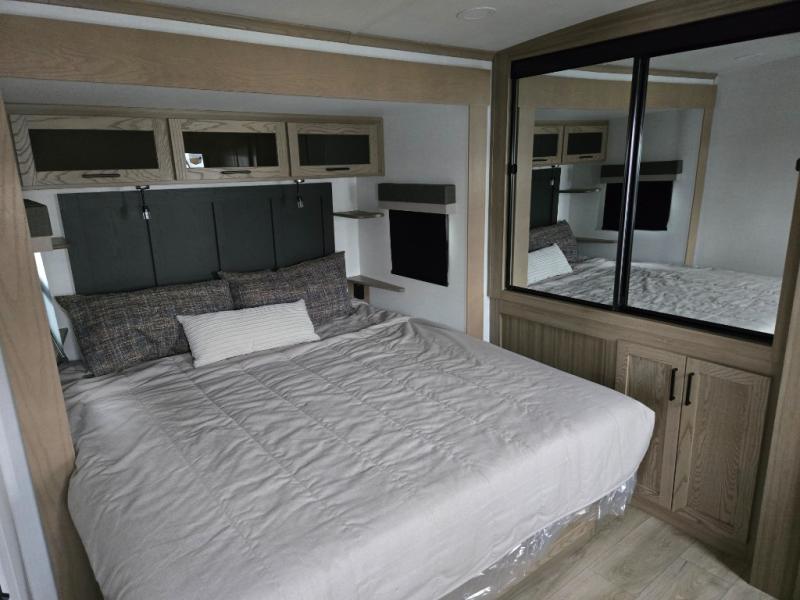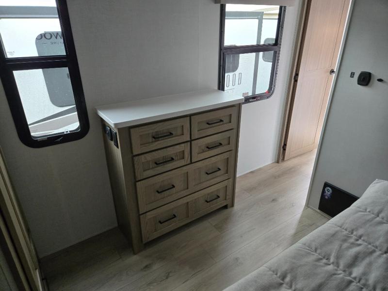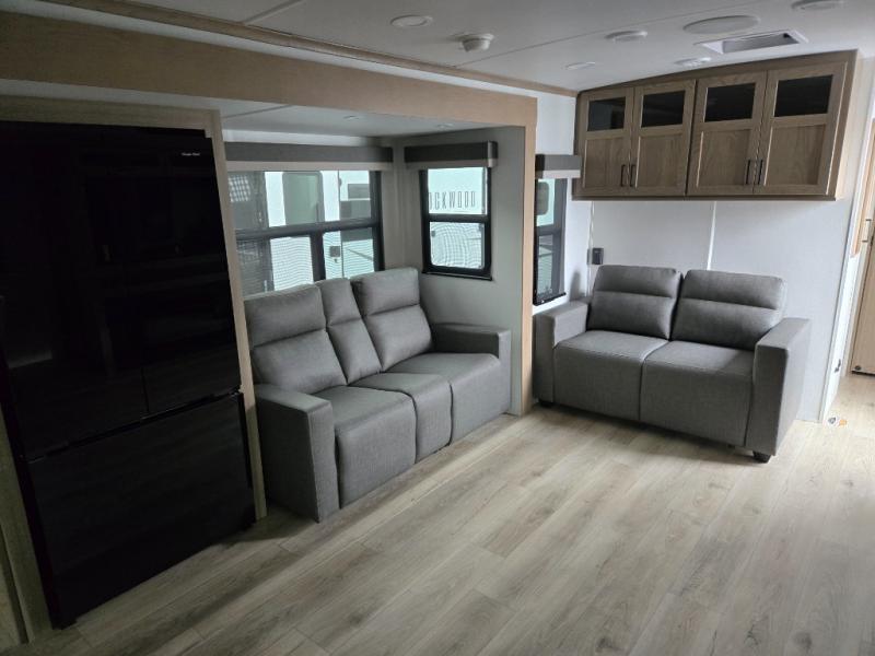 With any Rockwood Signature fifth wheel or travel trailer by Forest River RV, you will enjoy superior construction that includes laminated white fiberglass sidewalls, a radius roof with vaulted interior ceilings, plus radiant foil insulation and an enclosed underbelly for use in all types of weather. Some convenient exterior features include Keyed Alike locks, a rear ladder, a 200W solar panel, and a tire pressure monitor system with a monitor for added safety. The interior offers a One Touch OneControl panel with WeRV app control, for lights, awning, slides, water heater and more, and the Air 360+ omnidirectional antenna with WiFi prep lets you work while away from home if needed. You will also appreciate the interior vaulted ceilings, residential soft close doors and drawers, solid surface kitchen countertops, and designer kitchen backsplash!