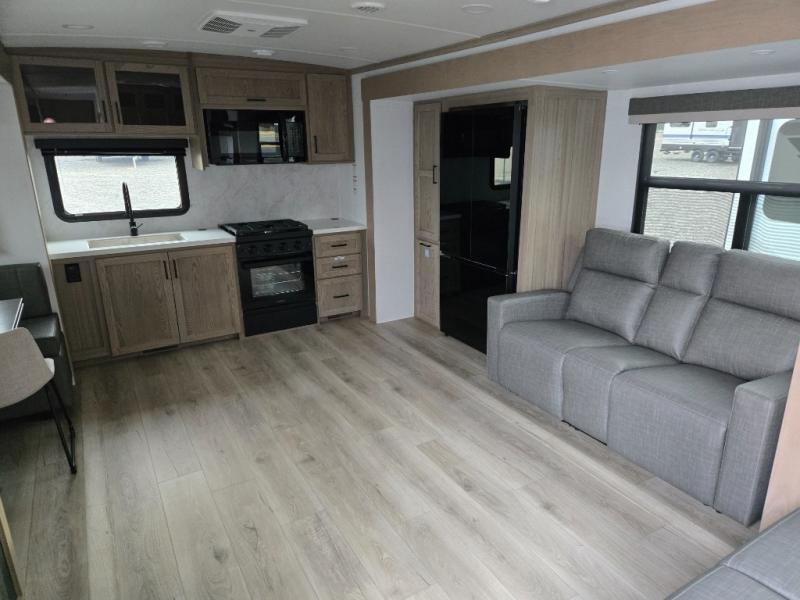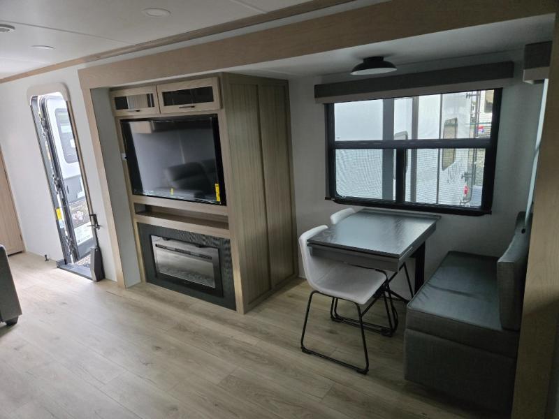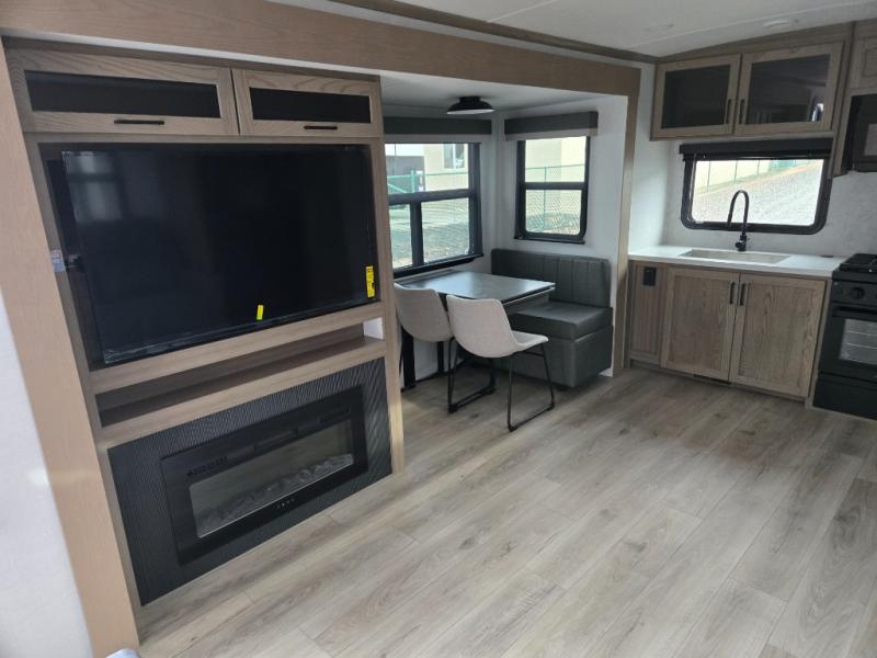 One step inside this rear kitchen travel trailer and you'll be sold! The dual opposing slides create an open floorplan you are sure to love, and you'll find plenty of seating spaces on the theater seat, the hide-a-bed sofa, and at the booth dinette. There is an entertainment center here with a Smart TV, plus a fireplace for those cooler nights. The full bath includes a shower with a seat, and the front private bedroom includes a queen bed slide out for more floor space. You can easily store your items in the large front wardrobe, plus there is a dresser and additional storage with washer and dryer prep. And check out the exterior with two power awnings, an outside kitchen, plus exterior storage for all your gear!