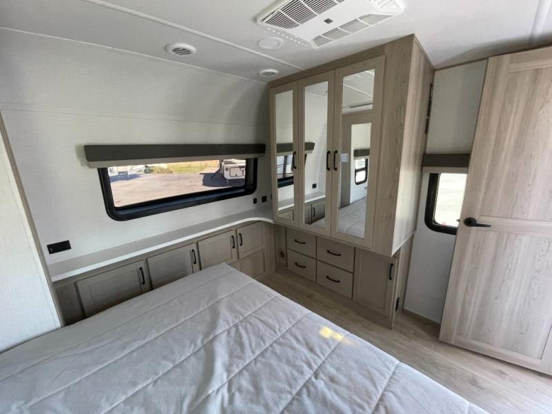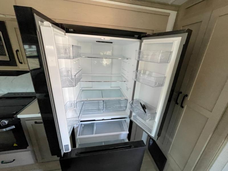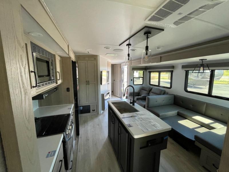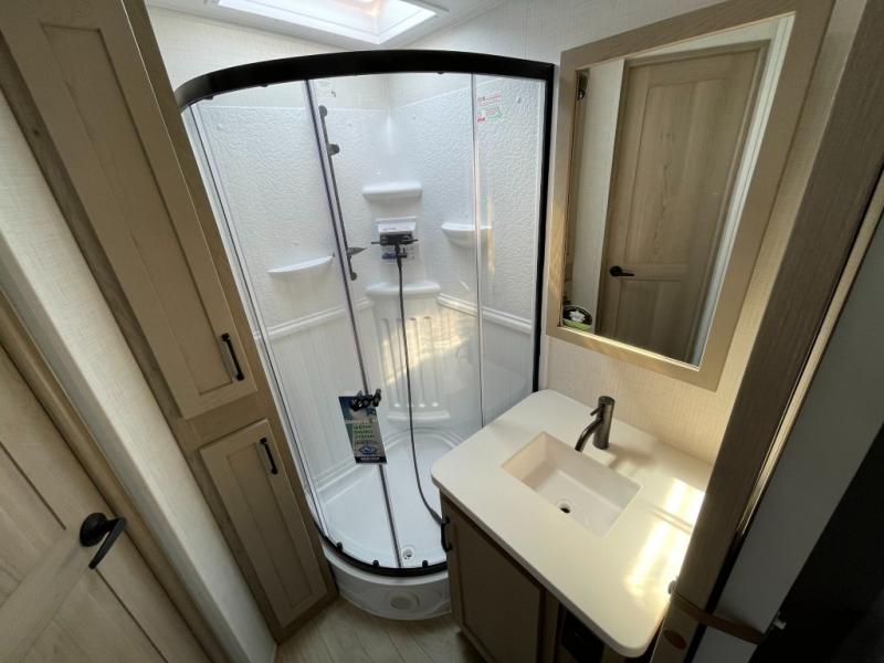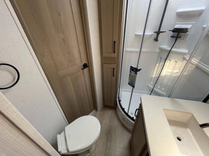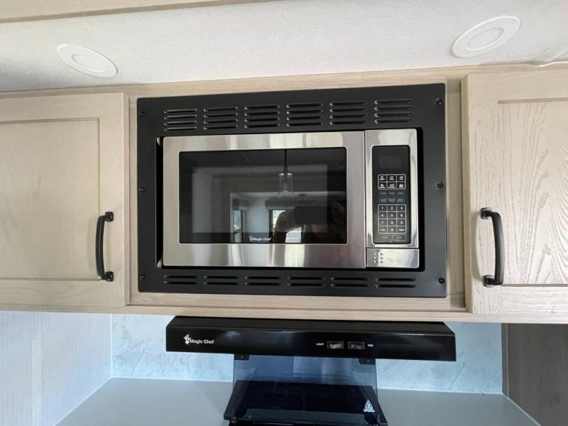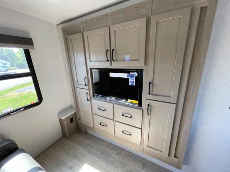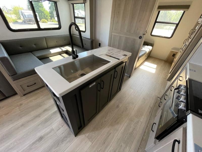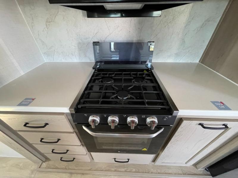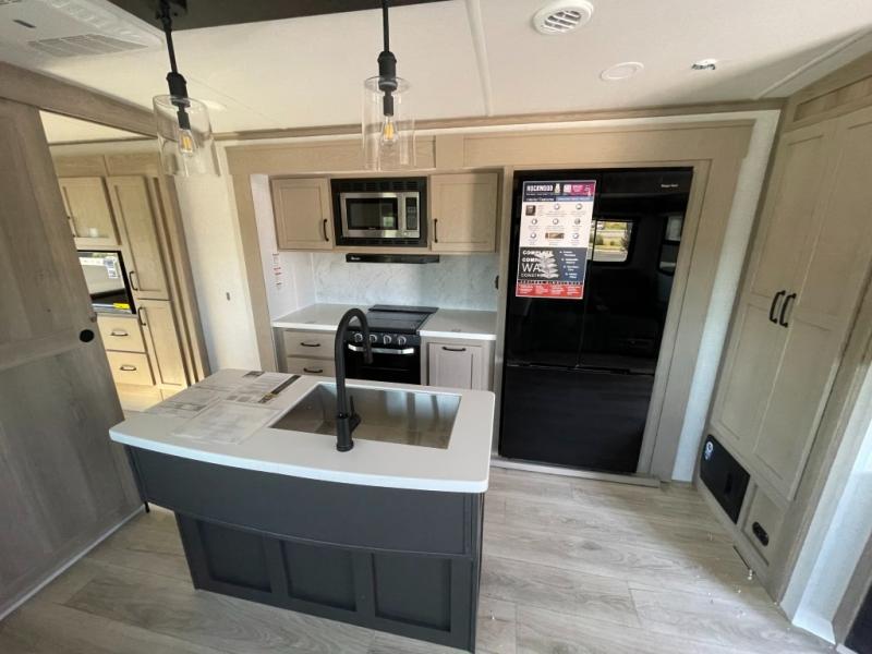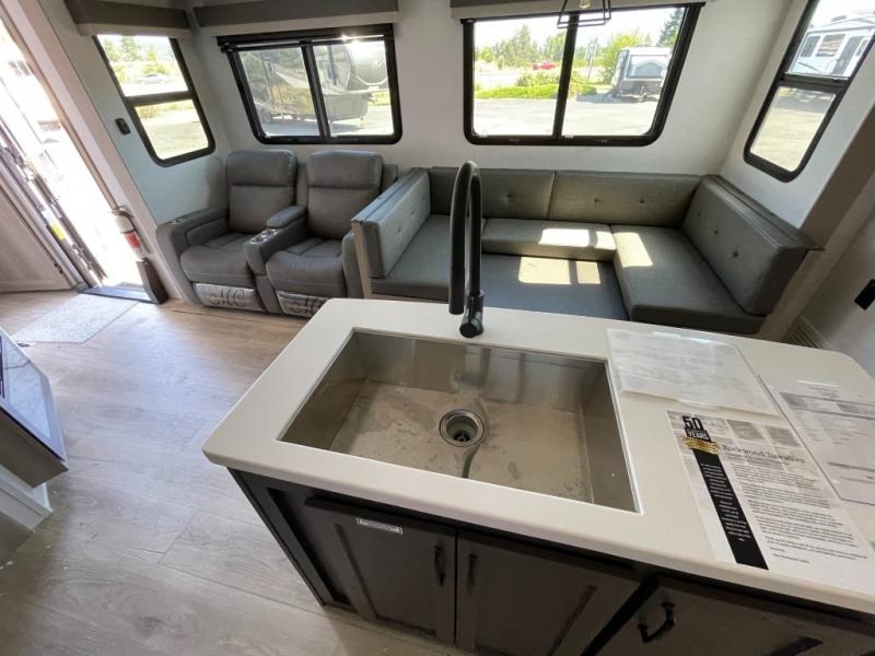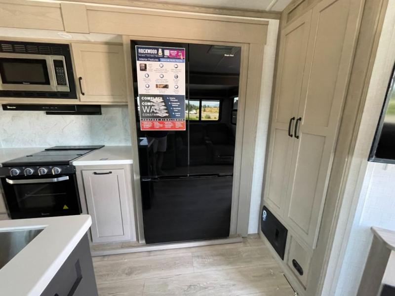 With any Rockwood Signature fifth wheel or travel trailer by Forest River RV, you will enjoy superior construction that includes laminated white fiberglass sidewalls, a radius roof with vaulted interior ceilings, plus radiant foil insulation and an enclosed underbelly for use in all types of weather. Some convenient exterior features include Keyed Alike locks, a rear ladder, a 200W solar panel, and a tire pressure monitor system with a monitor for added safety. The interior offers a One Touch OneControl panel with WeRV app control, for lights, awning, slides, water heater and more, and the Air 360+ omnidirectional antenna with WiFi prep lets you work while away from home if needed. You will also appreciate the interior vaulted ceilings, residential soft close doors and drawers, solid surface kitchen countertops, and designer kitchen backsplash!