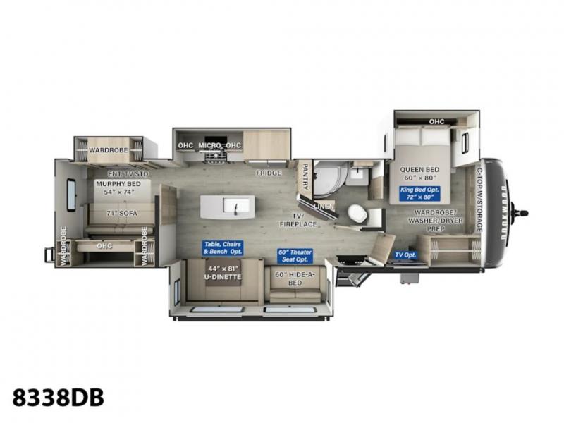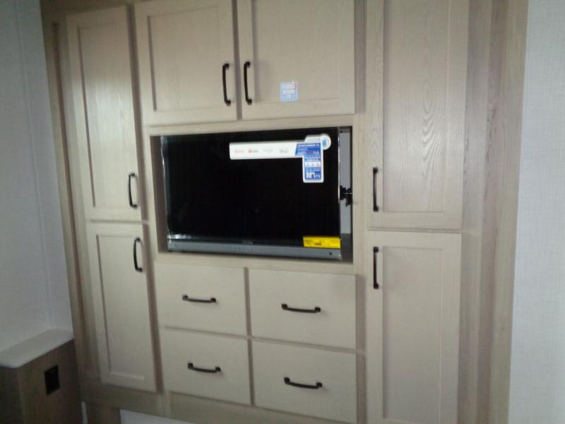 SEDONAWOOD-CHOCOLATE INTERIOR, 4.0 LEVELING SYSTEM, 15K BTU 3RD ROOF A/C, 4 SLIDE TOPPERS, SMART BEDROOM TV, THEATRE SEATING IPO HIDE-A-BED, KING BED IPO QUEEN BED-