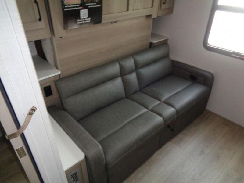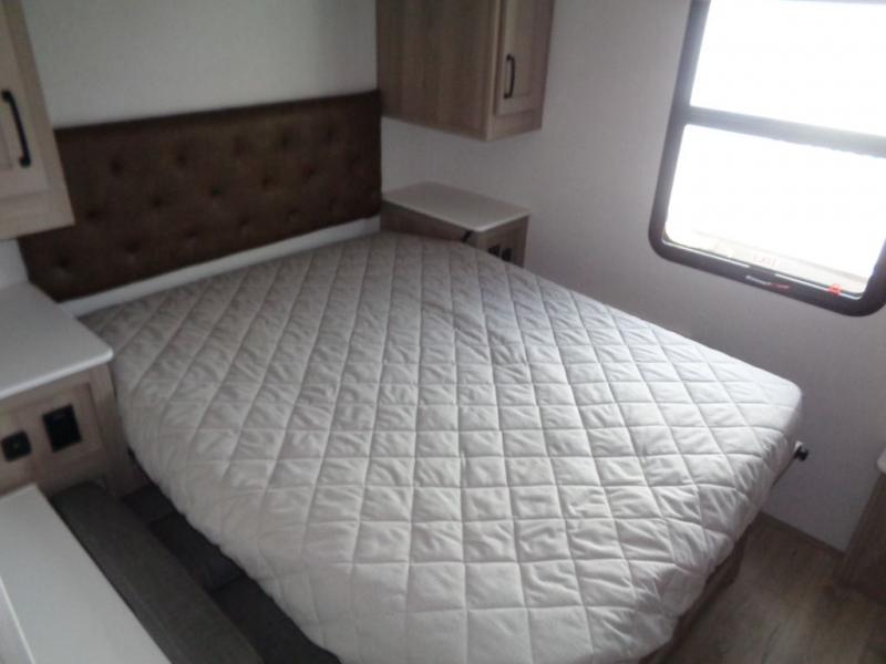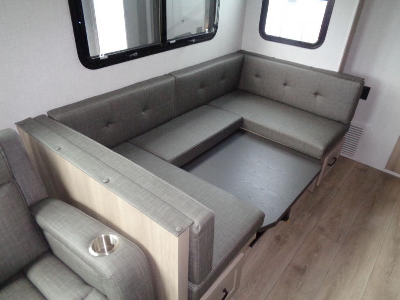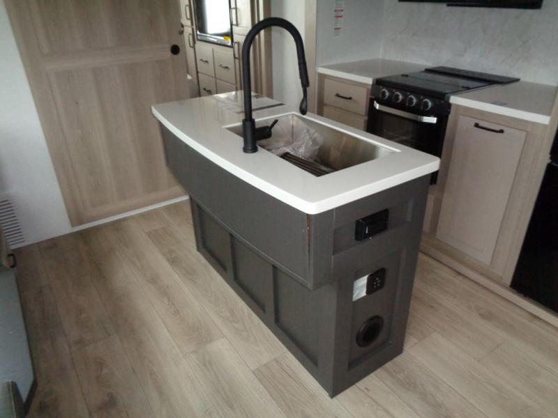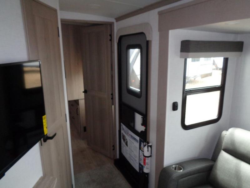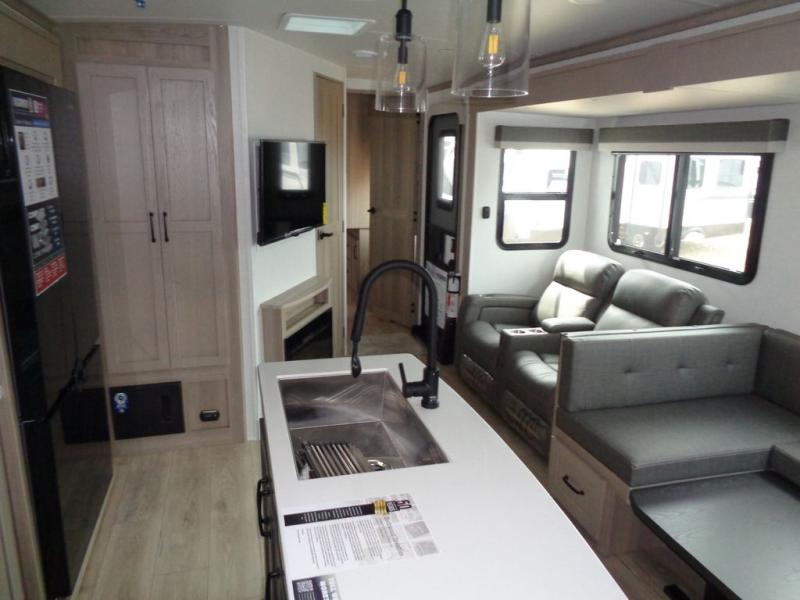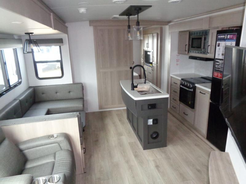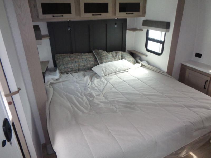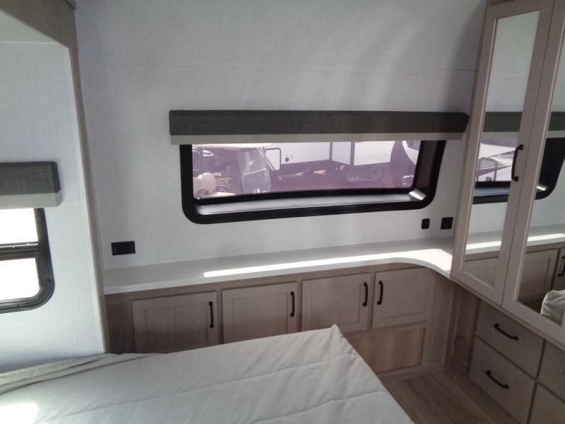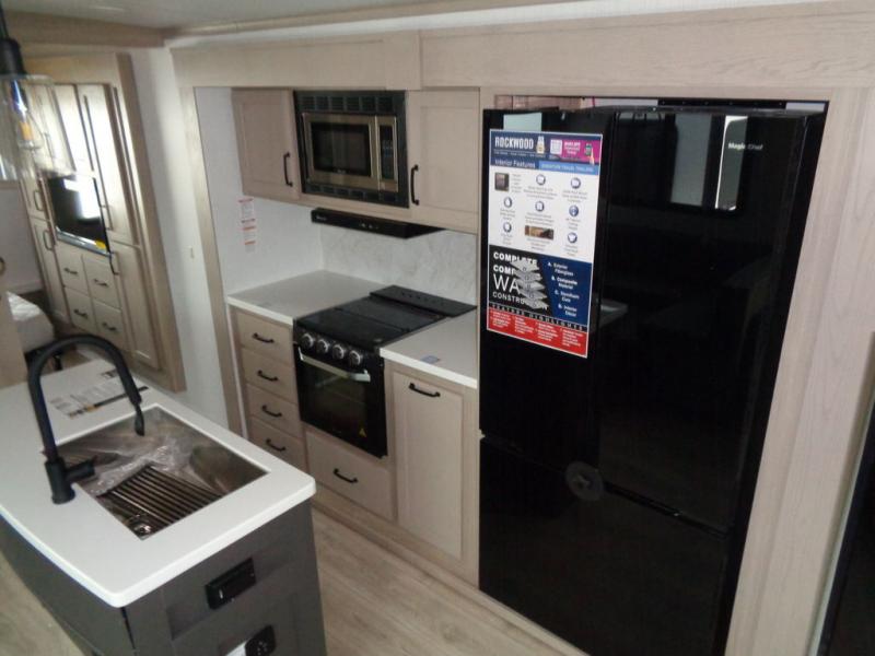 With any Rockwood Signature fifth wheel or travel trailer by Forest River RV, you will enjoy superior construction that includes laminated white fiberglass sidewalls, a radius roof with vaulted interior ceilings, plus radiant foil insulation and an enclosed underbelly for use in all types of weather. Some convenient exterior features include Keyed Alike locks, a rear ladder, a 200W solar panel, and a tire pressure monitor system with a monitor for added safety. The interior offers a One Touch OneControl panel with WeRV app control, for lights, awning, slides, water heater and more, and the Air 360+ omnidirectional antenna with WiFi prep lets you work while away from home if needed. You will also appreciate the interior vaulted ceilings, residential soft close doors and drawers, solid surface kitchen countertops, and designer kitchen backsplash!