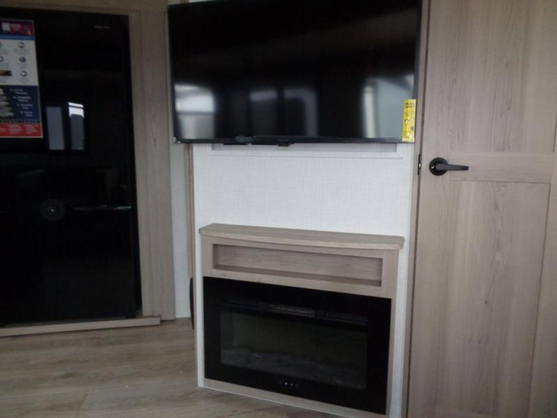Family vacations and weekend excursions with friends just got sweeter with this quad slide travel trailer in tow. The rear private bedroom includes a slide out for more space, a Murphy bed/74" sofa for versatility, and plenty of wardrobe storage. Head to the main living area to relax on the hide-a-bed sofa by the fireplace, or prepare lunch at the kitchen island. When it's time to call it a night, head to the front master bedroom to enjoy your queen bed slide out, large wardrobe, plus washer/dryer prep. You might also like to add the optional TV in the bedroom to enjoy a movie before falling asleep. On the outside, there are two power awnings for convenience and added outdoor living, plus Solid Step entry steps for a sturdy entrance into the trailer.