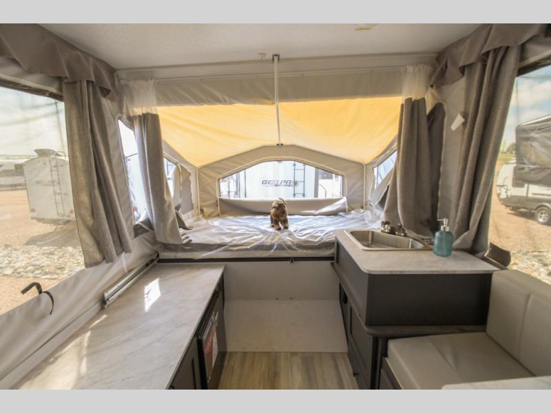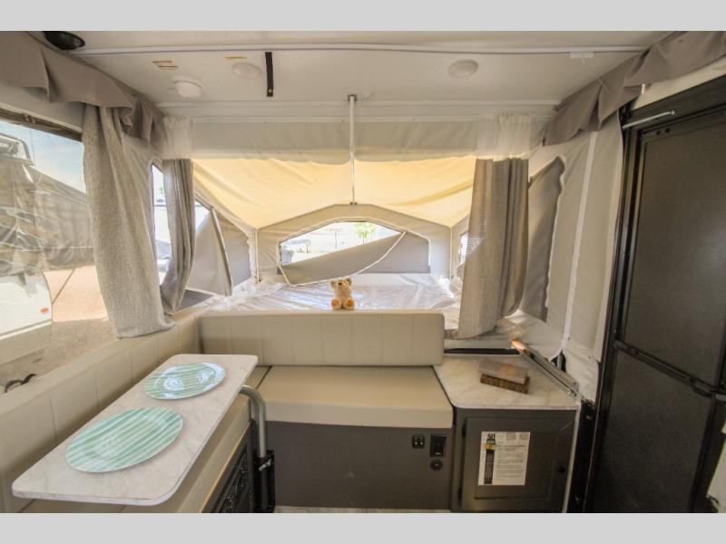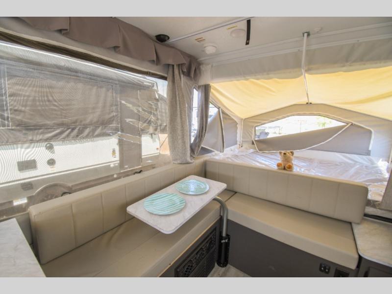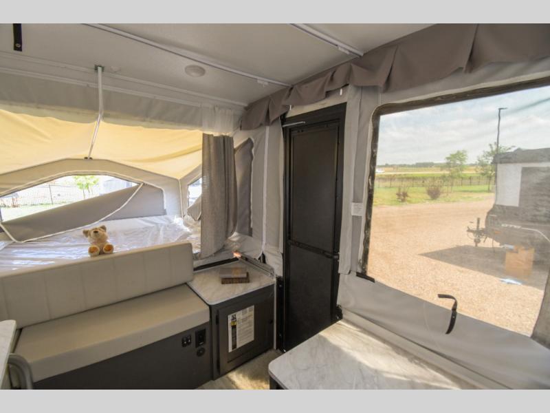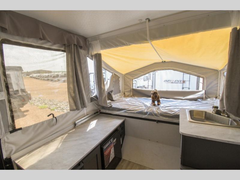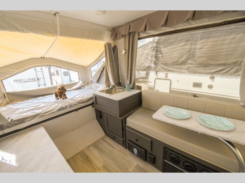 With any Rockwood Freedom Series by Forest River, you will enjoy added features to make each excursion one to remember. These folding pop-up campers feature a fiberglass laminated roof, wood plank flooring, and a Clay exterior with an alloy band. The leaf-spring axles, electric brakes, and balancing bead/nitrogen filled tires will make towing easier than ever, plus there are four stabilizer jacks with sand pads to help keep your unit secure. Each model also includes an awning with LED lighting outdoors, along with a one-piece screen door, two 20 lb. LP bottles, and a power roof lift to have you set up in no-time. Inside, the 15K under-bunk A/C and 20K BTU furnace will help keep you comfortable, and the Create-A-Breeze roof vent fan will keep the air moving!