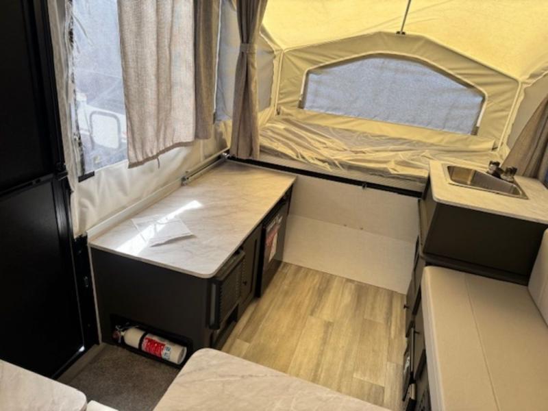 This compact camper will be perfect for outdoor trips to your favorite campground. There are two tent end beds for sleeping space, along with an L-shaped seat with a table for dining space. An extra guest or two little ones could even sleep here at night! The exterior griddle will let you make meals each day, and the 12V refrigerator will keep perishables fresh. This unit also includes an indoor sink so you can wash dishes and brush your teeth at night, and there is a 7' awning outdoors to enjoy some shade!
