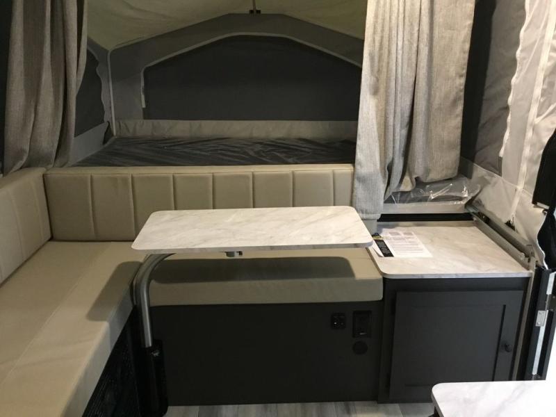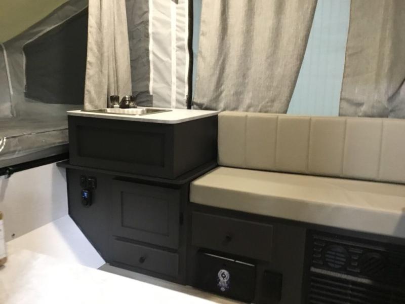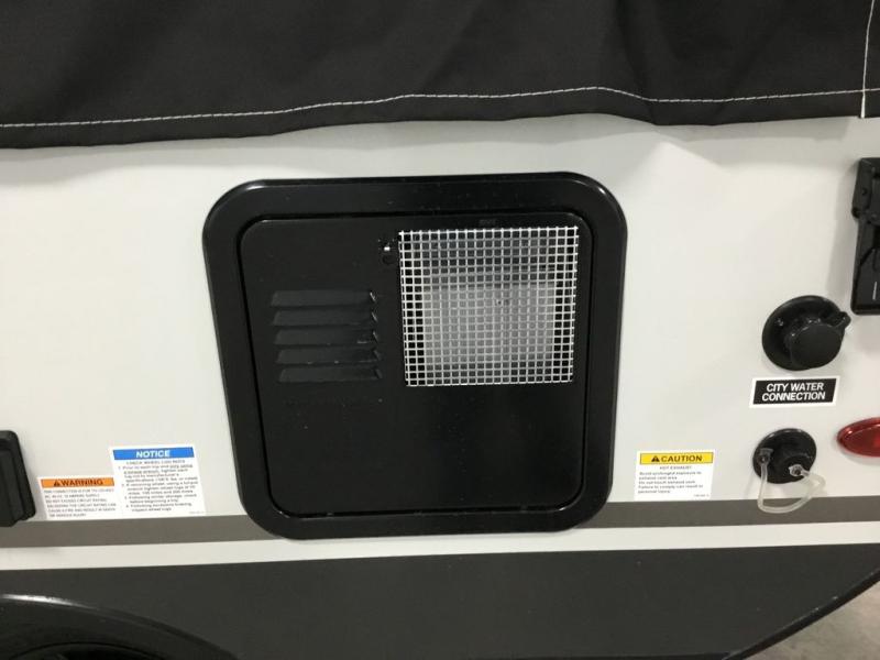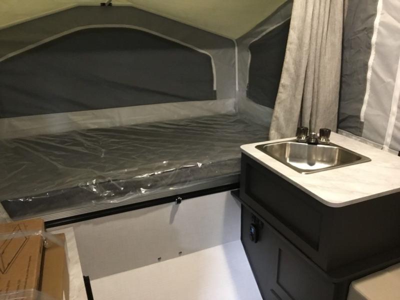 This compact camper will be perfect for outdoor trips to your favorite campground. There are two tent end beds for sleeping space, along with an L-shaped seat with a table for dining space. An extra guest or two little ones could even sleep here at night! The exterior griddle will let you make meals each day, and the 12V refrigerator will keep perishables fresh. This unit also includes an indoor sink so you can wash dishes and brush your teeth at night, and there is a 7' awning outdoors to enjoy some shade!