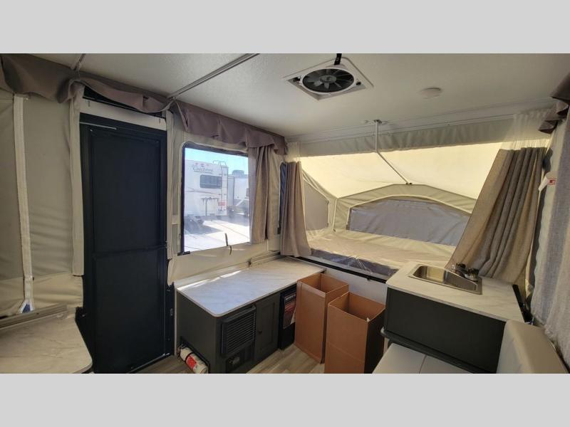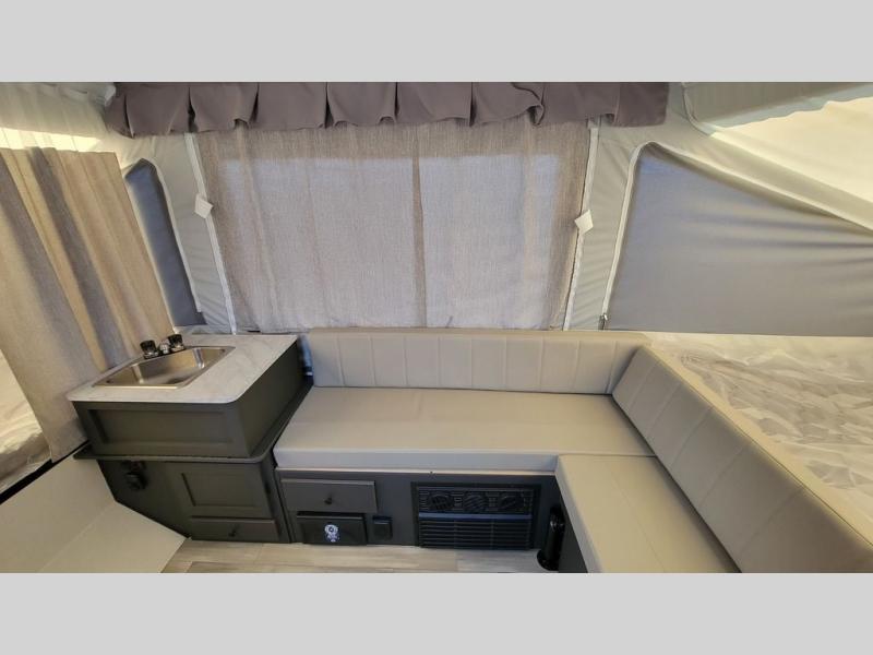 With any Rockwood Freedom Series by Forest River, you will enjoy added features to make each excursion one to remember. These folding pop-up campers feature a fiberglass laminated roof, wood plank flooring, and a Clay exterior with an alloy band. The leaf-spring axles, electric brakes, and balancing bead/nitrogen filled tires will make towing easier than ever, plus there are four stabilizer jacks with sand pads to help keep your unit secure. Each model also includes an awning with LED lighting outdoors, along with a one-piece screen door, two 20 lb. LP bottles, and a power roof lift to have you set up in no-time. Inside, the 15K under-bunk A/C and 20K BTU furnace will help keep you comfortable, and the Create-A-Breeze roof vent fan will keep the air moving!