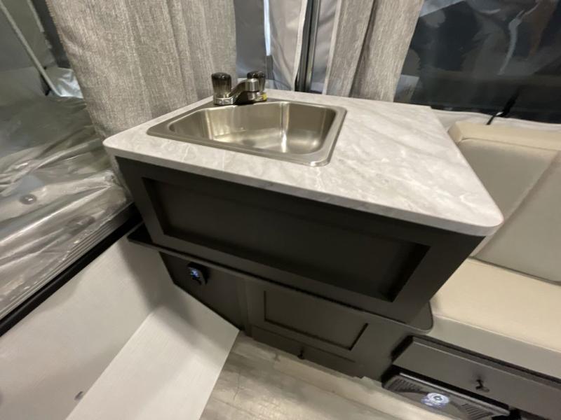 This compact camper will be perfect for outdoor trips to your favorite campground. There are two tent end beds for sleeping space, along with an L-shaped seat with a table for dining space. An extra guest or two little ones could even sleep here at night! The exterior griddle will let you make meals each day, and the 12V refrigerator will keep perishables fresh. This unit also includes an indoor sink so you can wash dishes and brush your teeth at night, and there is a 7' awning outdoors to enjoy some shade!