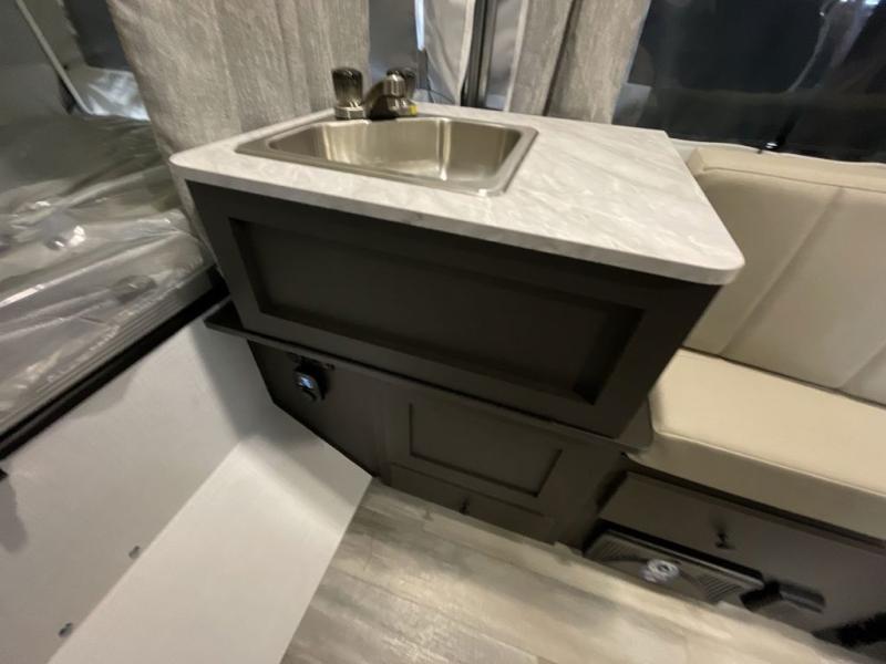 This compact camper will be perfect for outdoor trips to your favorite campground. There are two tent end beds for sleeping space, along with an L-shaped seat with a table for dining space. An extra guest or two little ones could even sleep here at night! The exterior griddle will let you make meals each day, and the 12V refrigerator will keep perishables fresh. This unit also includes an indoor sink so you can wash dishes and brush your teeth at night, and there is a 7' awning outdoors to enjoy some shade!