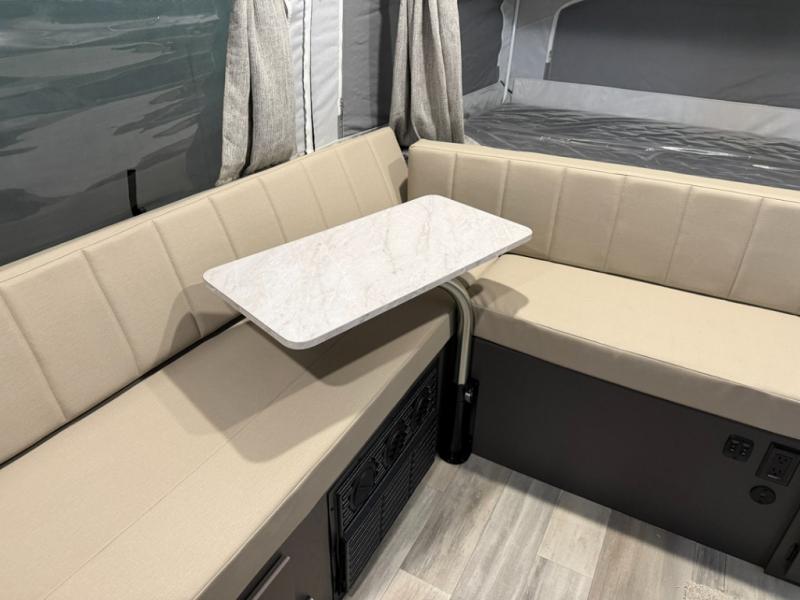 This compact camper will be perfect for outdoor trips to your favorite campground. There are two tent end beds for sleeping space, along with an L-shaped seat with a table for dining space. An extra guest or two little ones could even sleep here at night! The exterior griddle will let you make meals each day, and the 12V refrigerator will keep perishables fresh. This unit also includes an indoor sink so you can wash dishes and brush your teeth at night, and there is a 7' awning outdoors to enjoy some shade!