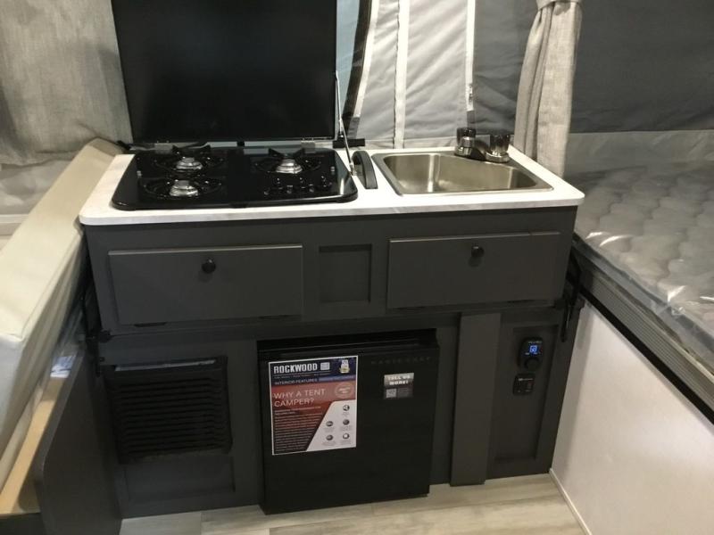 This Rockwood Freedom Series folding pop-up camper is going to let you camp in freedom! You will be able to use the permanently mounted three burner range to cook up some delicious food, and the 9' awning with an LED light will keep you protected while you work. You will also find that the booth dinette with added seating will be useful for both meal time and bed time when the two tent end beds aren't enough space, and the storage lid under the front bed provides storage for luggage, blankets, and more!