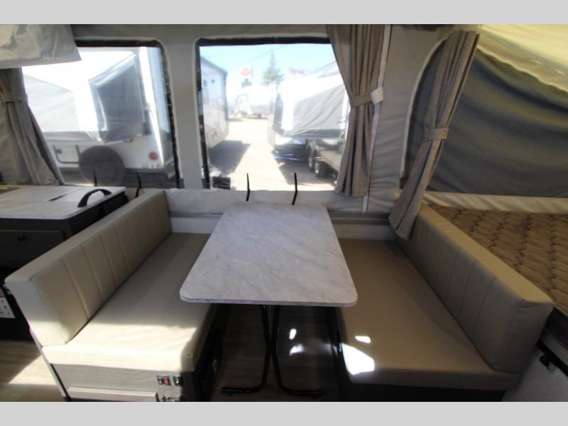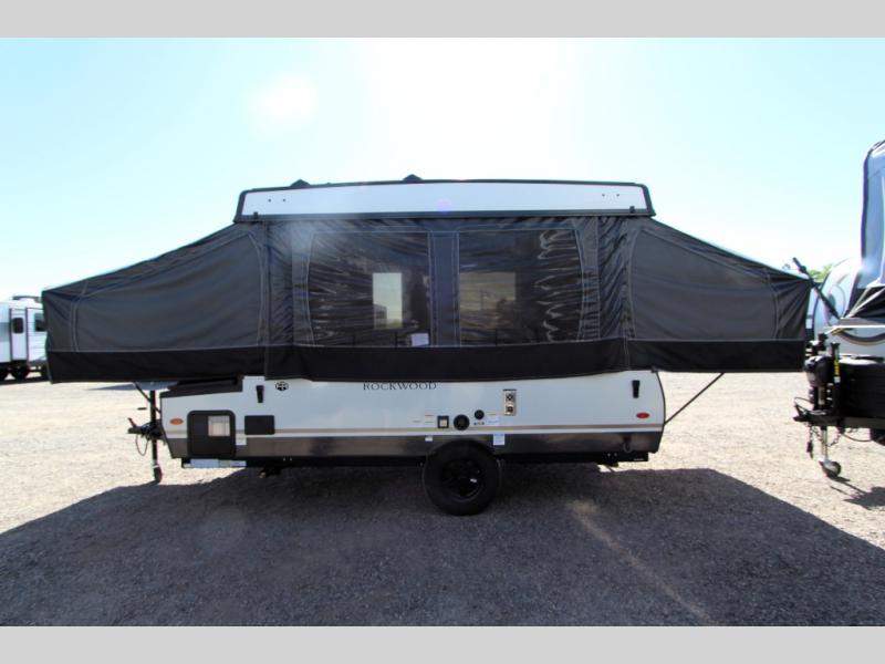 This Rockwood Freedom Series folding pop-up camper is going to let you camp in freedom! You will be able to use the outdoor griddle to cook up some delicious food, and the 9' awning with an LED light will keep you protected while you work. You will also find that the booth dinette will be useful for both meal time and bed time when the two tent end beds aren't enough space, and the storage lid under the front bed provides storage for luggage, blankets, and more!