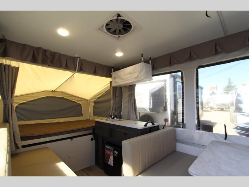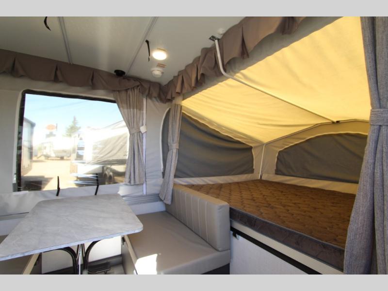 With any Rockwood Freedom Series by Forest River, you will enjoy added features to make each excursion one to remember. These folding pop-up campers feature a fiberglass laminated roof, wood plank flooring, and a Clay exterior with an alloy band. The leaf-spring axles, electric brakes, and balancing bead/nitrogen filled tires will make towing easier than ever, plus there are four stabilizer jacks with sand pads to help keep your unit secure. Each model also includes an awning with LED lighting outdoors, along with a one-piece screen door, two 20 lb. LP bottles, and a power roof lift to have you set up in no-time. Inside, the 15K under-bunk A/C and 20K BTU furnace will help keep you comfortable, and the Create-A-Breeze roof vent fan will keep the air moving!