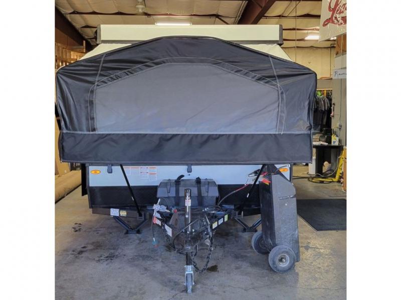 This Rockwood Freedom Series folding pop-up camper is going to let you camp in freedom! You will be able to use the outdoor griddle to cook up some delicious food, and the 9' awning with an LED light will keep you protected while you work. You will also find that the booth dinette will be useful for both meal time and bed time when the two tent end beds aren't enough space, and the storage lid under the front bed provides storage for luggage, blankets, and more!