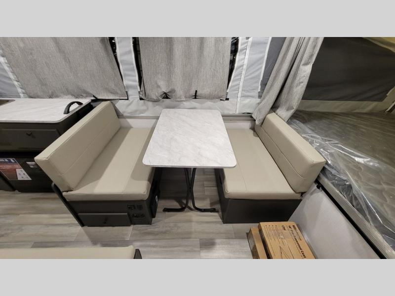With any Rockwood Freedom Series by Forest River, you will enjoy added features to make each excursion one to remember. These folding pop-up campers feature a fiberglass laminated roof, wood plank flooring, and a Clay exterior with an alloy band. The leaf-spring axles, electric brakes, and balancing bead/nitrogen filled tires will make towing easier than ever, plus there are four stabilizer jacks with sand pads to help keep your unit secure. Each model also includes an awning with LED lighting outdoors, along with a one-piece screen door, two 20 lb. LP bottles, and a power roof lift to have you set up in no-time. Inside, the 15K under-bunk A/C and 20K BTU furnace will help keep you comfortable, and the Create-A-Breeze roof vent fan will keep the air moving!