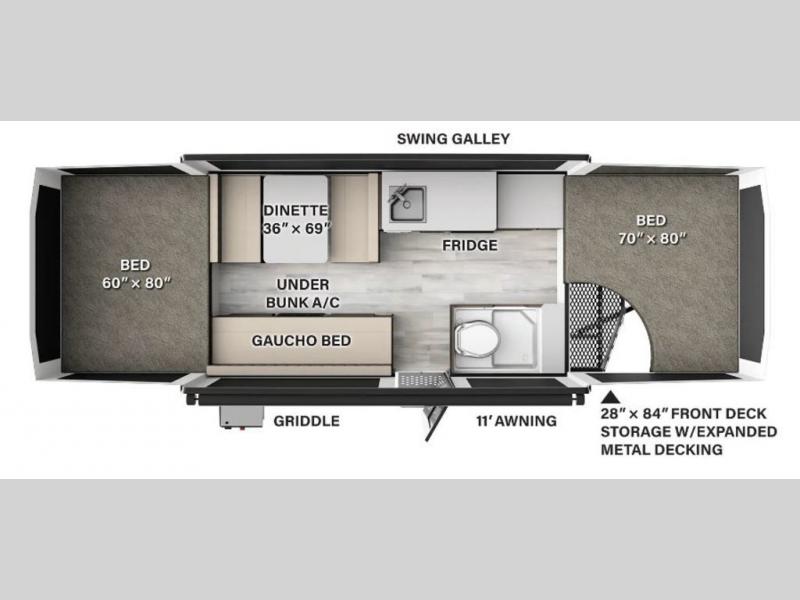 This Rockwood Freedom Series folding pop-up camper is going to let you camp in freedom! You will be able to use the outdoor griddle to cook up some delicious food, and the 11' awning with an LED light will keep you protected while you work. You will also find that the booth dinette will be useful for both meal time and bed time when the two tent end beds aren't enough space, along with the gaucho bed. This camper also includes a front deck storage with expanded metal decking for all your camping gear!
