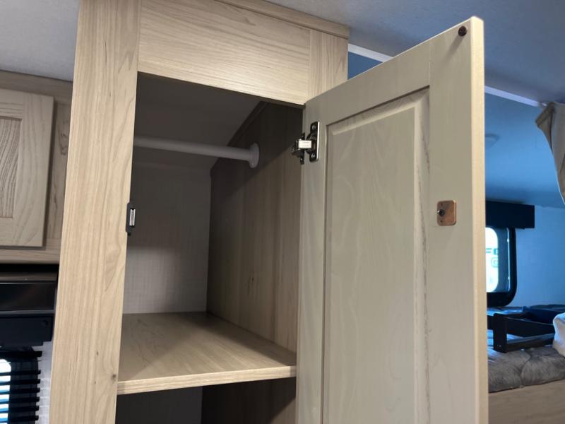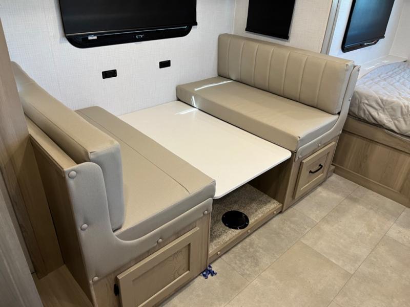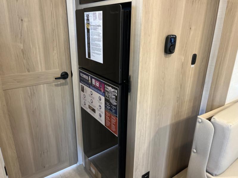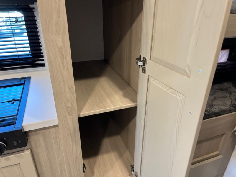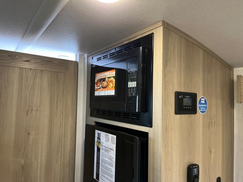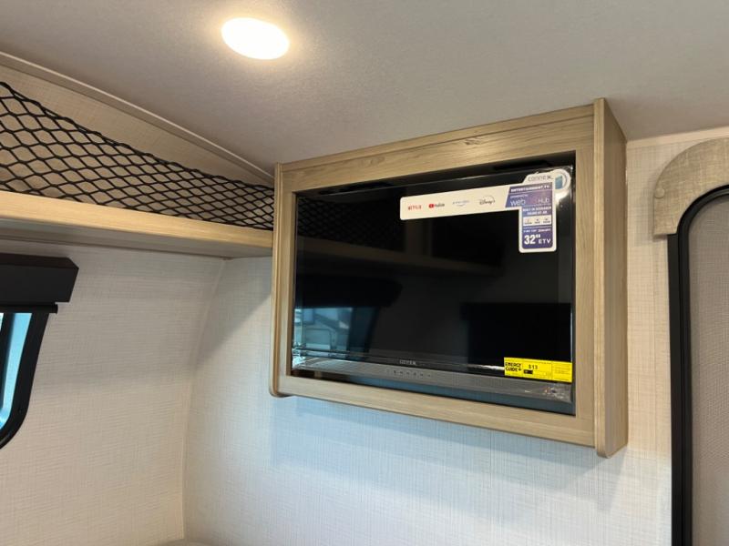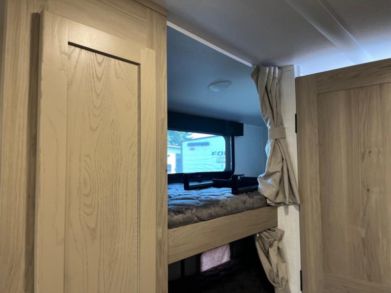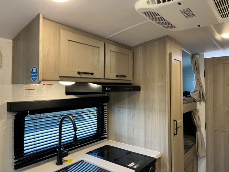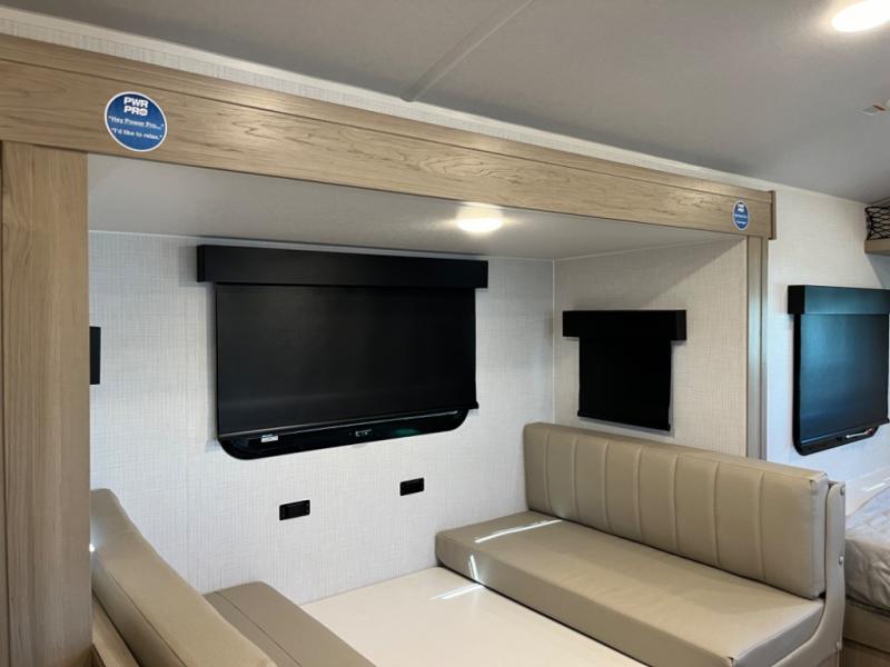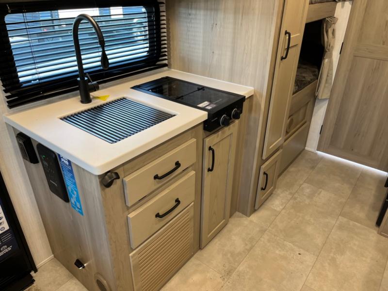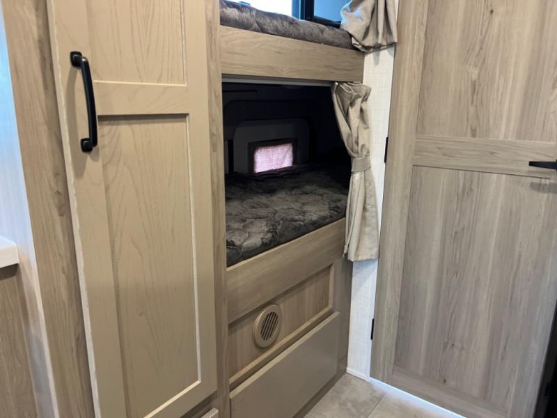 You're going to love camping with your family or friends in this spacious bunk model! The bunk beds will be perfect for little ones, while you take the front full-size bed. There is also a 44" booth dinette within the slide out for additional sleeping and seating space. The kitchen includes everything the chef will need to prepare meals each day, including a recessed cooktop, microwave oven, and a 12V refrigerator for perishables. If the weather is nice, you may just find the chef outdoors cooking on the outside griddle under the 14' power awning. And check out the exterior bike door that will be perfect for bikes, luggage, or extra camp gear. The optional Power Package available on this model includes three 200W solar panels, a 460 Ah Mastervolt MLI lithium-ion battery, two smart remotes, and more off-grid features!