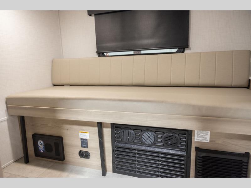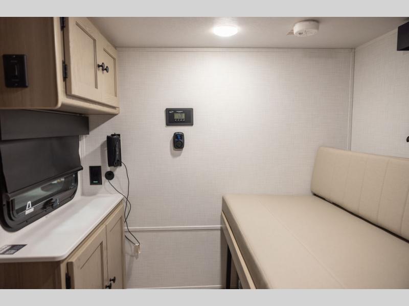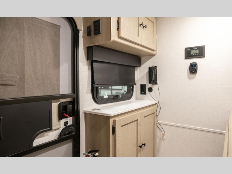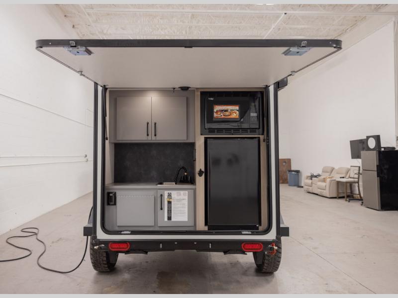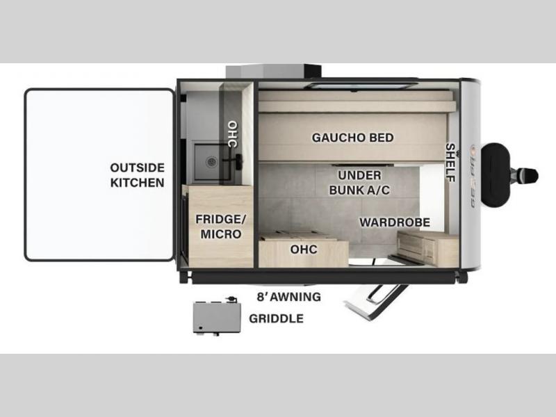 This is the perfect trailer to take on weekend trips to the lake! You'll enjoy a gaucho bed that can convert to your sleeping space at night, and there is a wardrobe to keep your clothes tidy. There is also a shelf here for more storage space! The outside kitchen includes a 12V refrigerator and a convection microwave, plus a griddle to cook meals on.