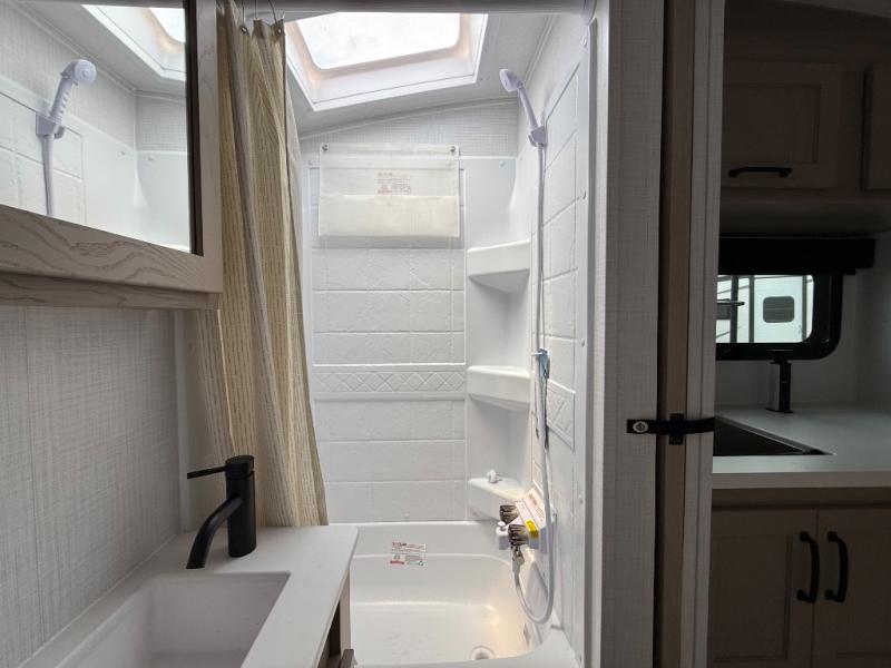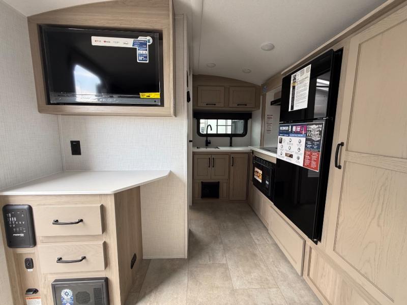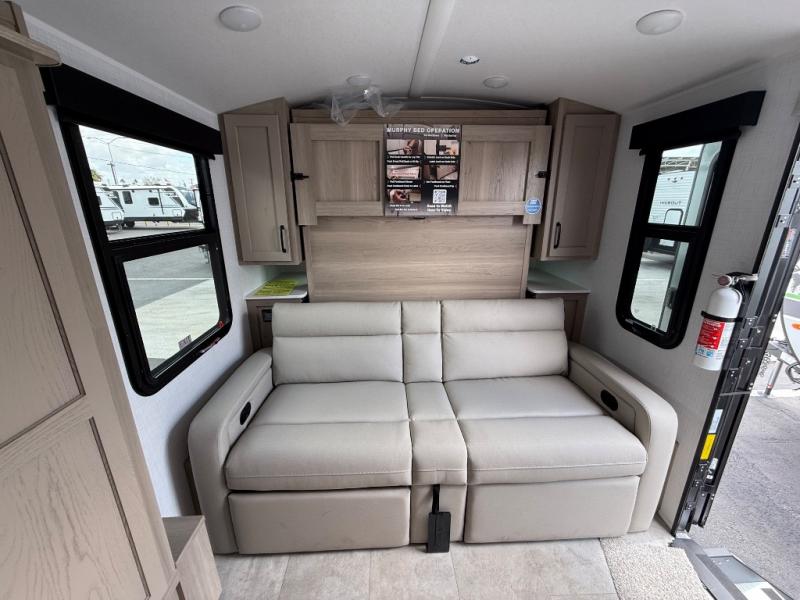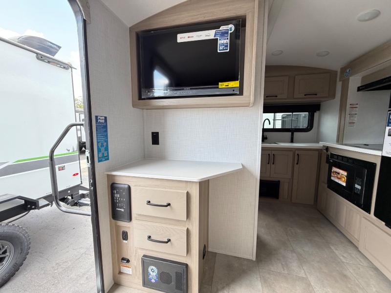 Pack your bags and head to your local state park in this travel trailer! You will love the extra space you have thanks to the kitchen slide out, and the jack knife sofa can fold away at night so you can sleep on the Murphy bed! This model includes a 32" 12V TV to keep you entertained on those rainy days, and the full bath will let you get cleaned up if you decide to hike despite the weather. There will be plenty of storage space for your belongings and gear since there is a pass-through storage and additional exterior storage, and don't overlook the exterior griddle for breakfast outdoors!
