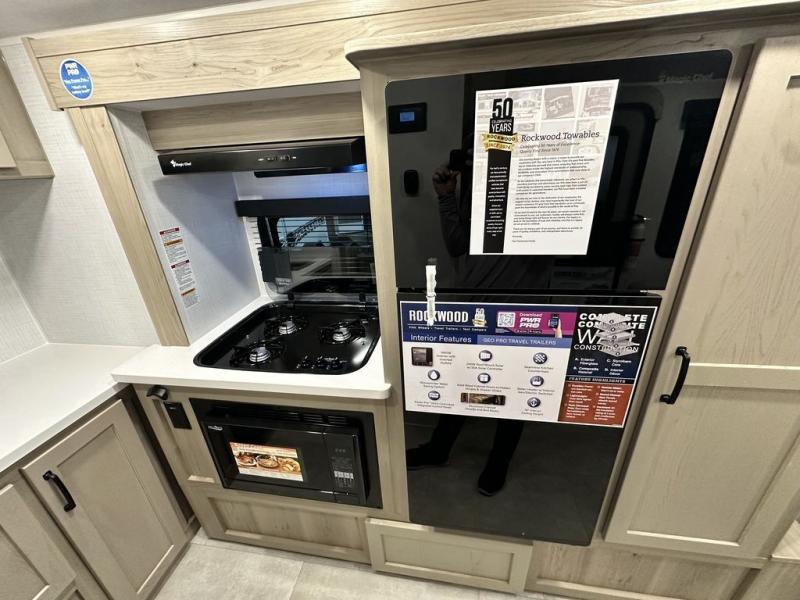 With any Rockwood GEO Pro travel trailer by Forest River you will enjoy easy towing, durable construction, and off-road capabilities with larger 15" tires and a lift kit! Each model is constructed with complete composite wall construction for added strength and durability, and the torsion axle, Rubber-Ryde suspension will make towing easier than ever. Inside, you'll find sleek roller shades for added privacy, a 12V refrigerator and a microwave, plus a 20,000 BTU furnace to keep you warm during the colder camping months.