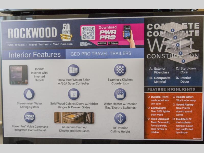 With any Rockwood GEO Pro travel trailer by Forest River you will enjoy easy towing, durable construction, and off-road capabilities with larger 15" tires and a lift kit! Each model is constructed with complete composite wall construction for added strength and durability, and the torsion axle, Rubber-Ryde suspension will make towing easier than ever. Inside, you'll find sleek roller shades for added privacy, a 12V refrigerator and a microwave, plus a 20,000 BTU furnace to keep you warm during the colder camping months.