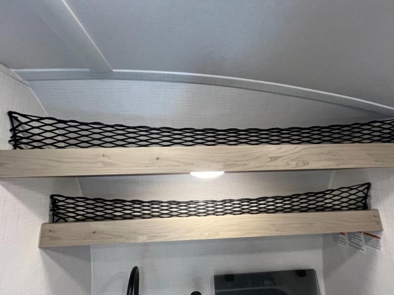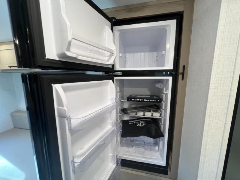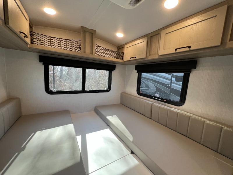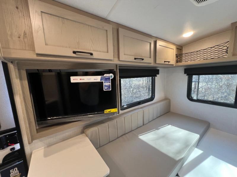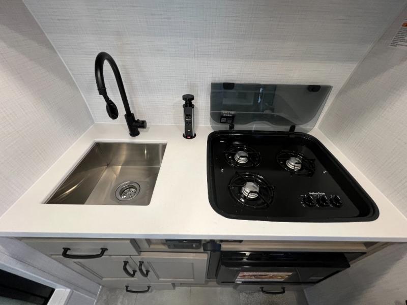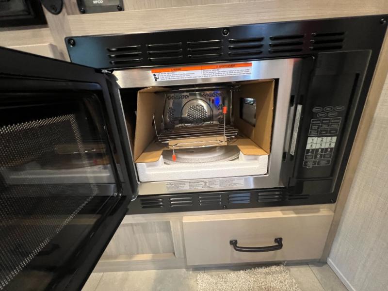 It won't be hard to find comfort in this travel trailer. It may be smaller on size, but it doesn't skim on features. The twin beds convert to a king-size bed for your comfort, and there is even a 32" 12V TV to enjoy in the evenings. The kitchen includes a three burner cooktop, a convection microwave, plus a 12V refrigerator for perishables. You'll find overhead compartments for your valuables and exterior storage for your hiking gear!