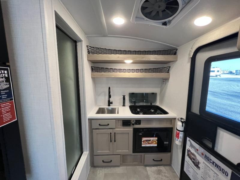 With any Rockwood GEO Pro travel trailer by Forest River you will enjoy easy towing, durable construction, and off-road capabilities with larger 15" tires and a lift kit! Each model is constructed with complete composite wall construction for added strength and durability, and the torsion axle, Rubber-Ryde suspension will make towing easier than ever. Inside, you'll find sleek roller shades for added privacy, a 12V refrigerator and a microwave, plus a 20,000 BTU furnace to keep you warm during the colder camping months.