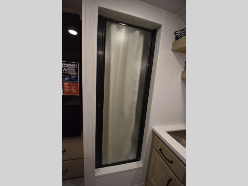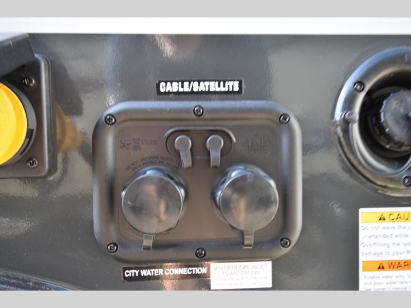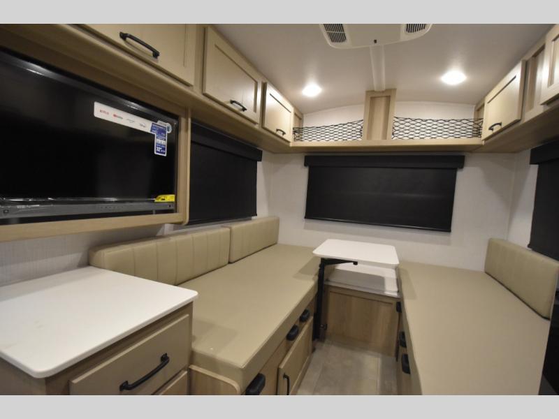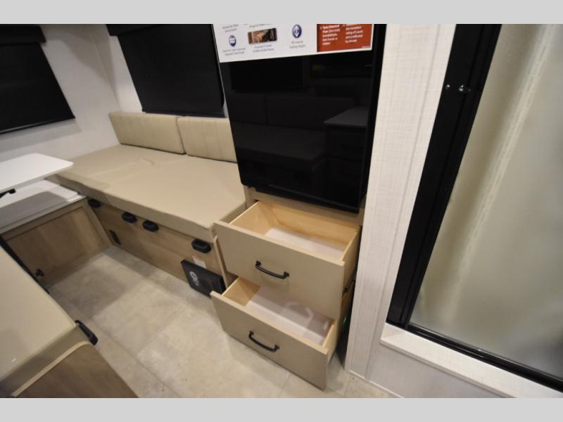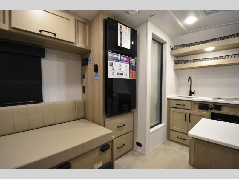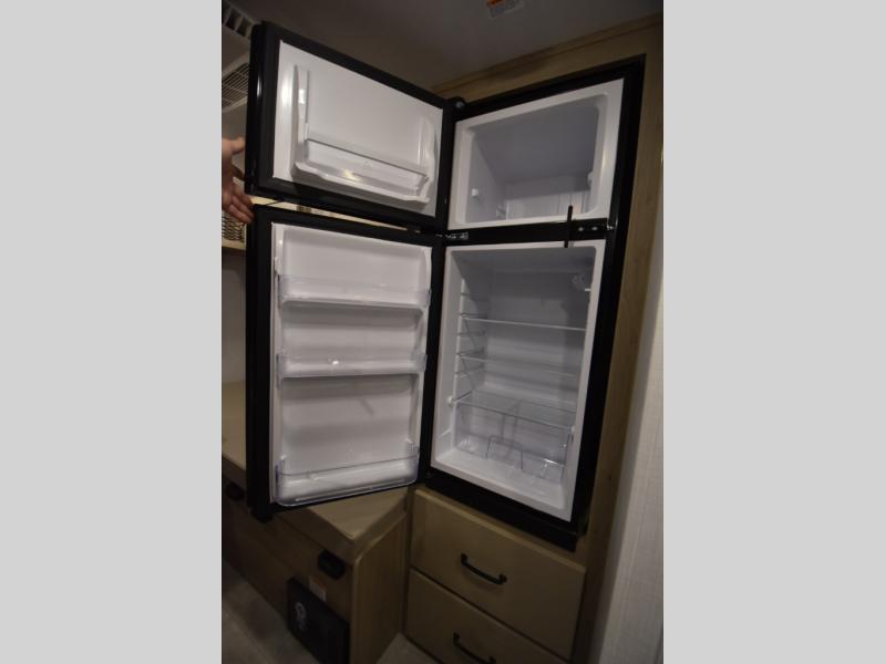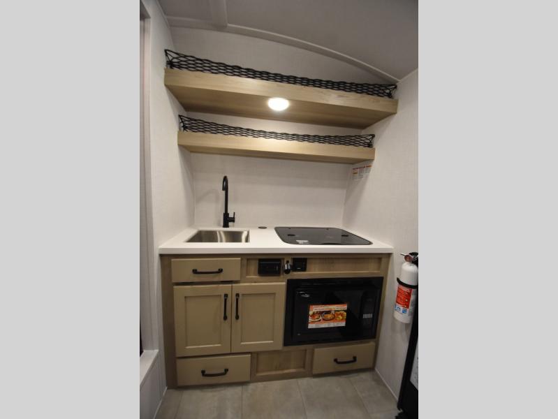 It won't be hard to find comfort in this travel trailer. It may be smaller on size, but it doesn't skim on features. The twin beds convert to a king-size bed for your comfort, and there is even a 32" 12V TV to enjoy in the evenings. The kitchen includes a three burner cooktop, a convection microwave, plus a 12V refrigerator for perishables. You'll find overhead compartments for your valuables and exterior storage for your hiking gear!