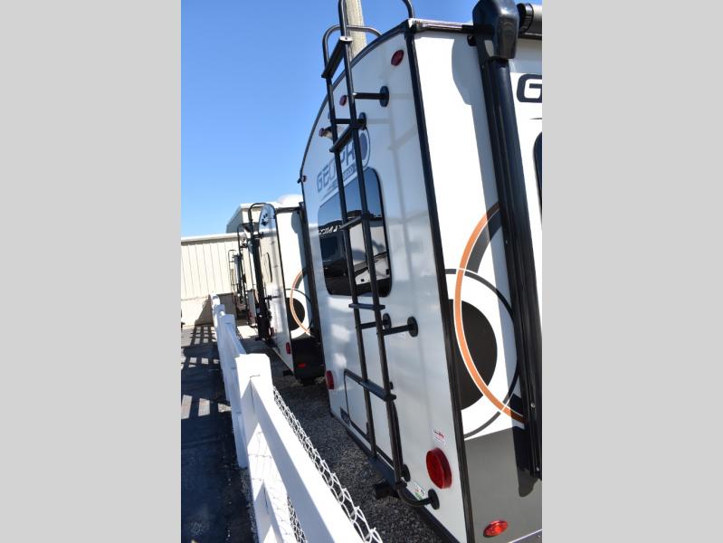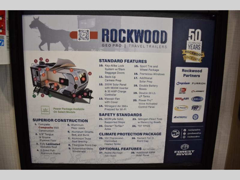 With any Rockwood GEO Pro travel trailer by Forest River you will enjoy easy towing, durable construction, and off-road capabilities with larger 15" tires and a lift kit! Each model is constructed with complete composite wall construction for added strength and durability, and the torsion axle, Rubber-Ryde suspension will make towing easier than ever. Inside, you'll find sleek roller shades for added privacy, a 12V refrigerator and a microwave, plus a 20,000 BTU furnace to keep you warm during the colder camping months.