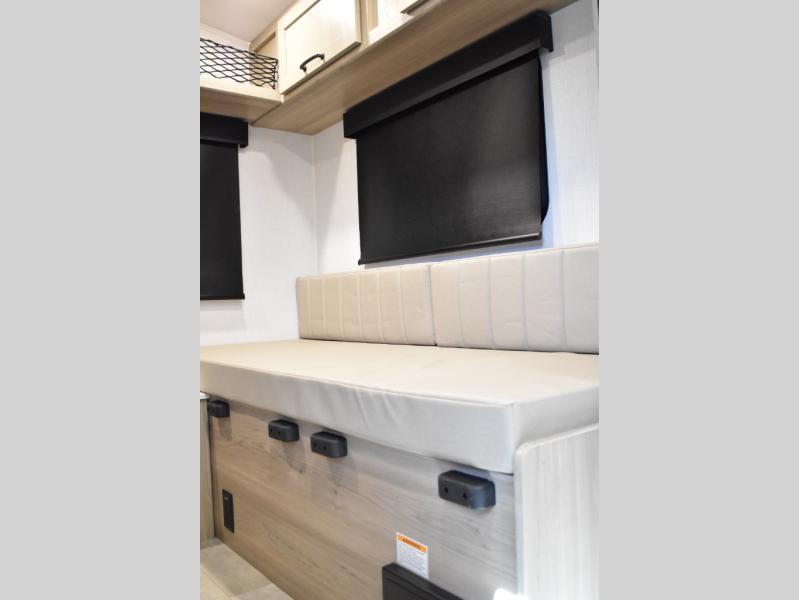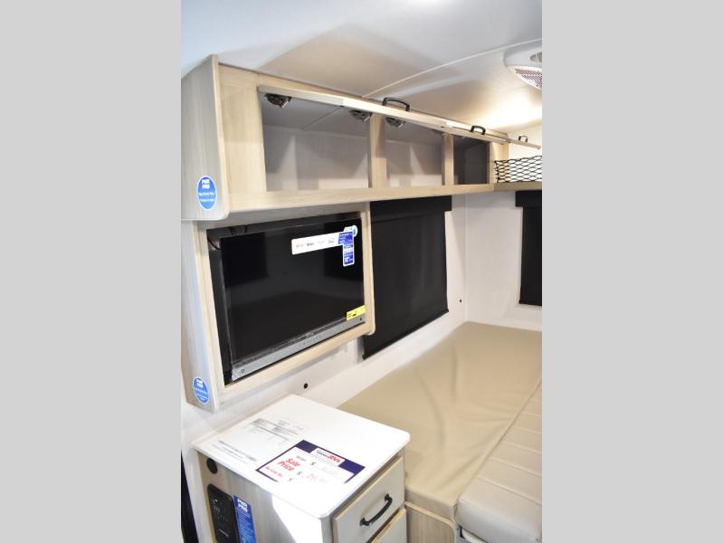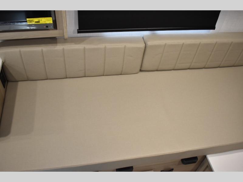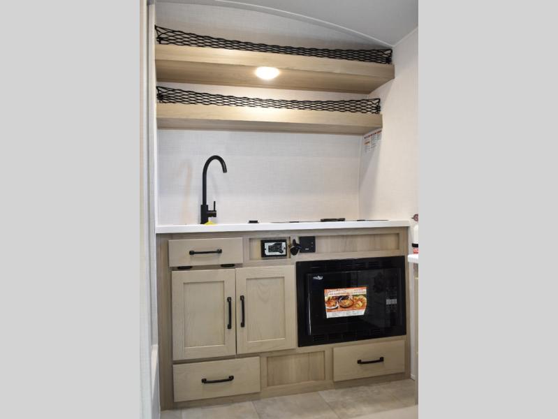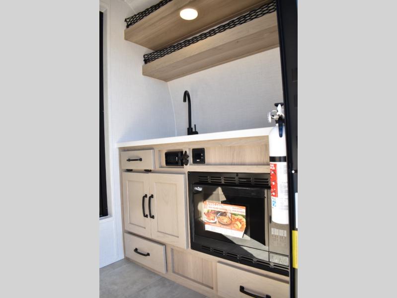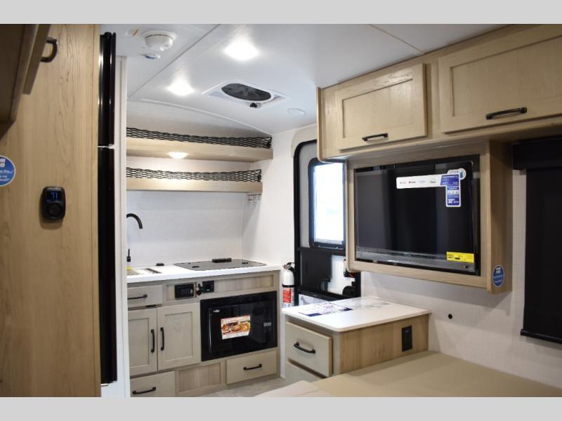 It won't be hard to find comfort in this travel trailer. It may be smaller on size, but it doesn't skim on features. The twin beds convert to a king-size bed for your comfort, and there is even a 32" 12V TV to enjoy in the evenings. The kitchen includes a three burner cooktop, a convection microwave, plus a 12V refrigerator for perishables. You'll find overhead compartments for your valuables and exterior storage for your hiking gear!