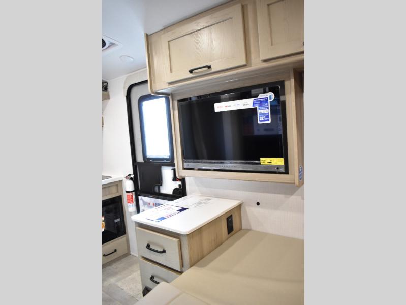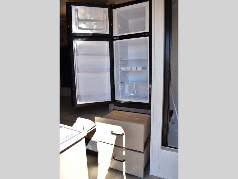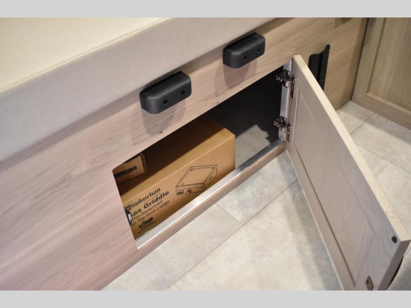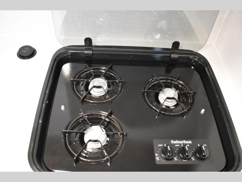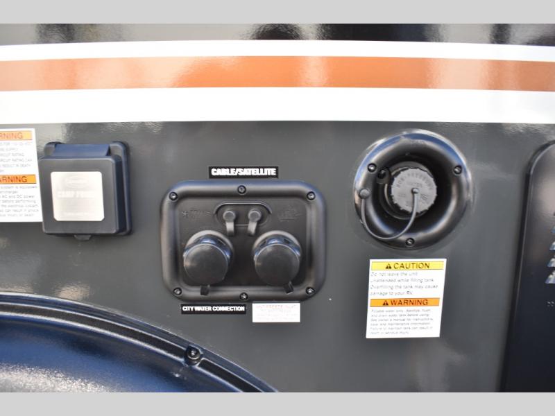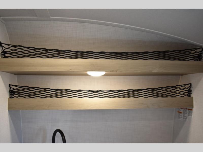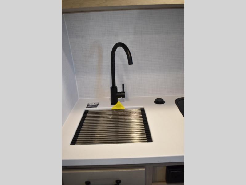It won't be hard to find comfort in this travel trailer. It may be smaller on size, but it doesn't skim on features. The twin beds convert to a king-size bed for your comfort, and there is even a 32" 12V TV to enjoy in the evenings. The kitchen includes a three burner cooktop, a convection microwave, plus a 12V refrigerator for perishables. You'll find overhead compartments for your valuables and exterior storage for your hiking gear!