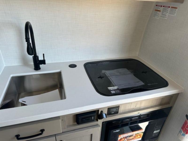 It won't be hard to find comfort in this travel trailer. It may be smaller on size, but it doesn't skim on features. The twin beds convert to a king-size bed for your comfort, and there is even a 32" 12V TV to enjoy in the evenings. The kitchen includes a three burner cooktop, a convection microwave, plus a 12V refrigerator for perishables. You'll find overhead compartments for your valuables and exterior storage for your hiking gear!