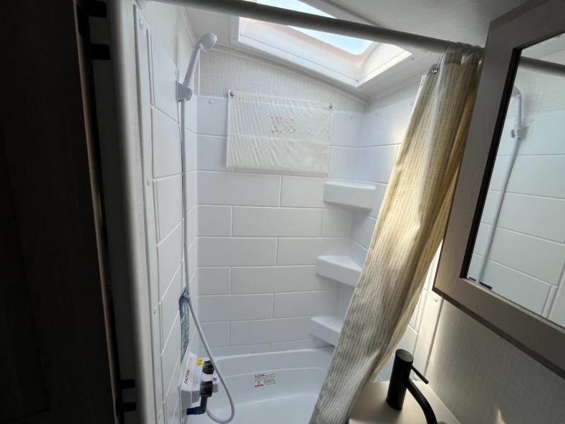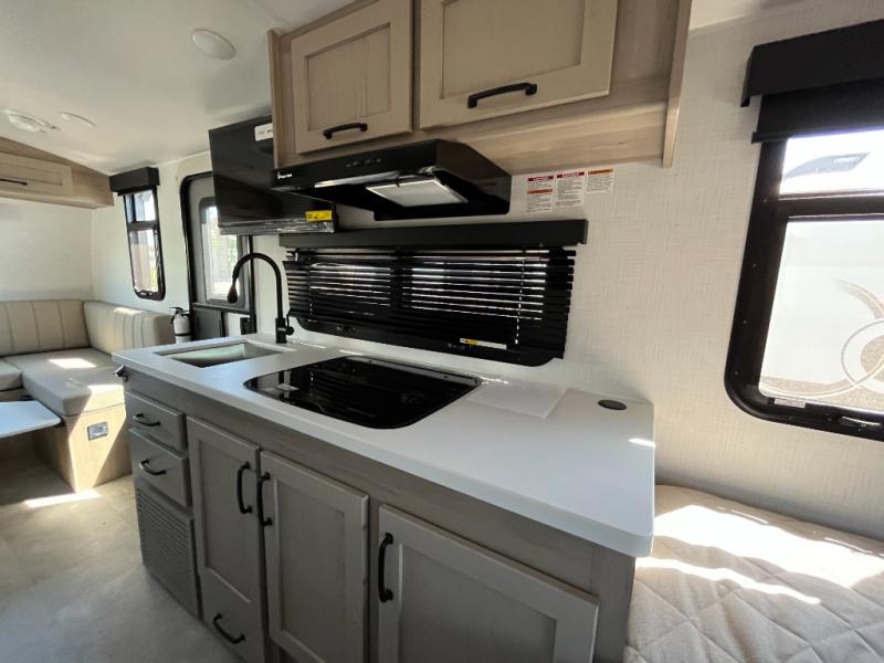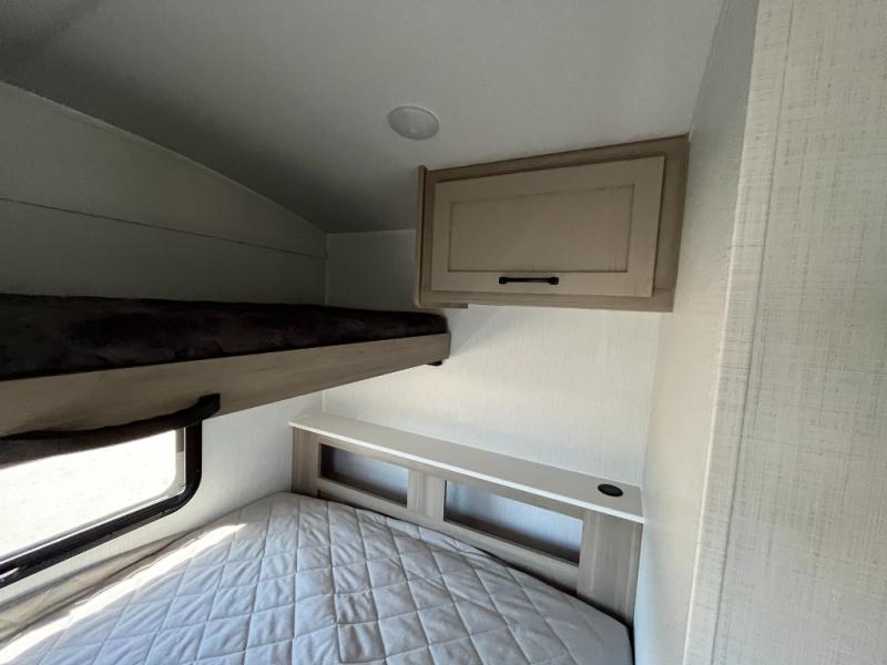 You'll love camping in this travel trailer that can sleep five each night. There is a front U-shaped dinette, a rear 54" x 74" full-size bed, plus a 26" x 80" flip-up bunk! A three burner cooktop and microwave oven let you create your best meals, and there is a 15' power awning and an exterior griddle if you want to cook outdoors. The full bath gives you privacy when freshening up after a day outdoors, and you'll find plenty of storage space in this unit, including in the overhead cabinets and the exterior pass-thru storage!