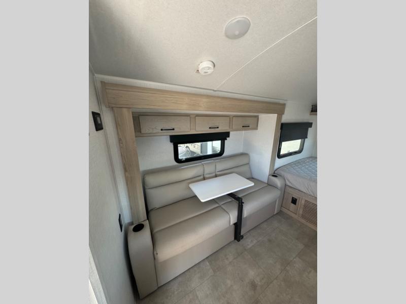 This is the perfect couple's trailer, so sneak away for a weekend in the woods. There is a 72" sofa with cupholders with a table that will be perfect for meals times and relaxing. This model includes a 32" 12V TV to keep you busy on those rainy days, and the queen bed will provide a great night's rest. This model also includes an outside griddle and an 11' power awning so you can enjoy those nice days outdoors!