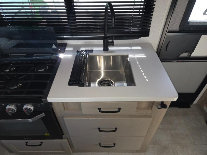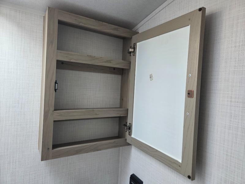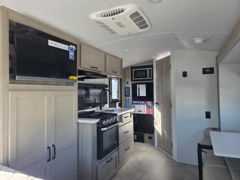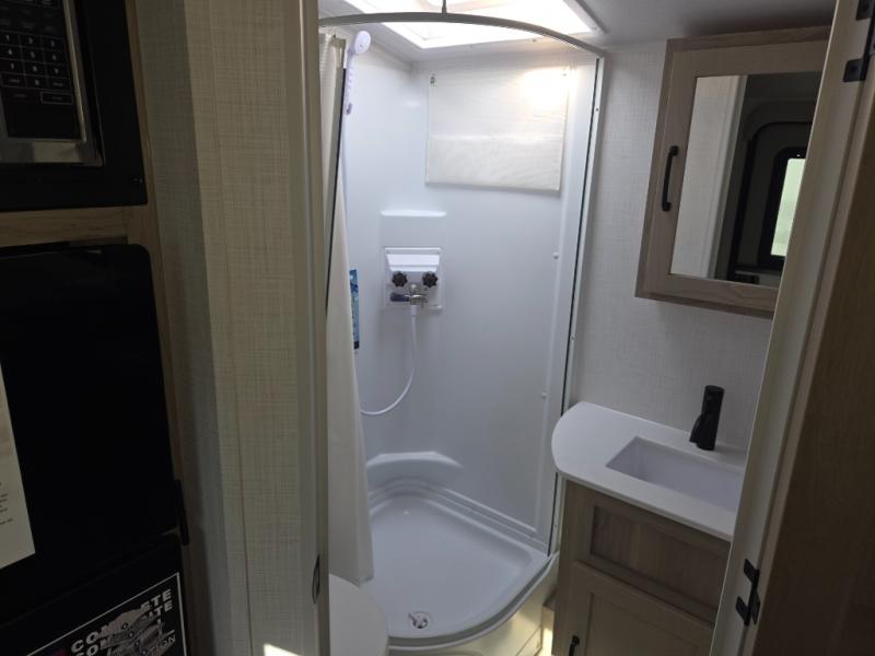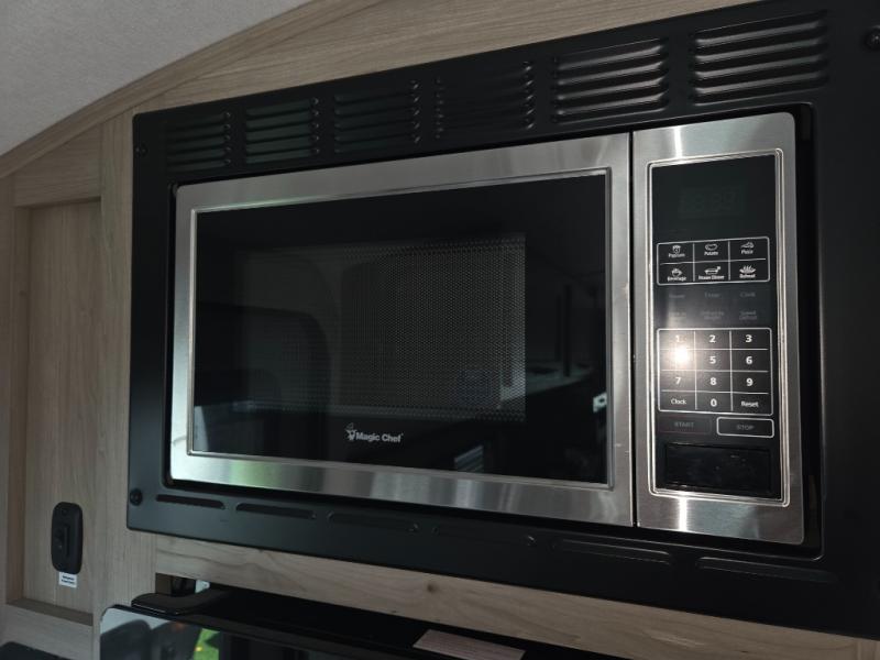 Enjoy simple meal prep with a microwave oven and 32" 12V refrigerator, plus the convenience of a full bathroom that offers privacy and comfort wherever you travel.