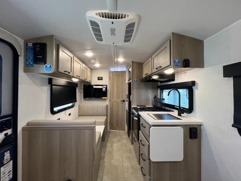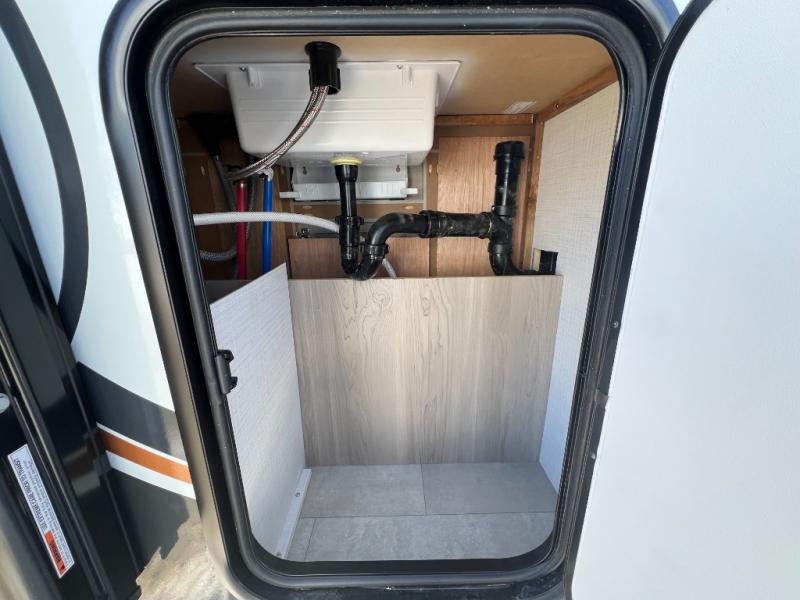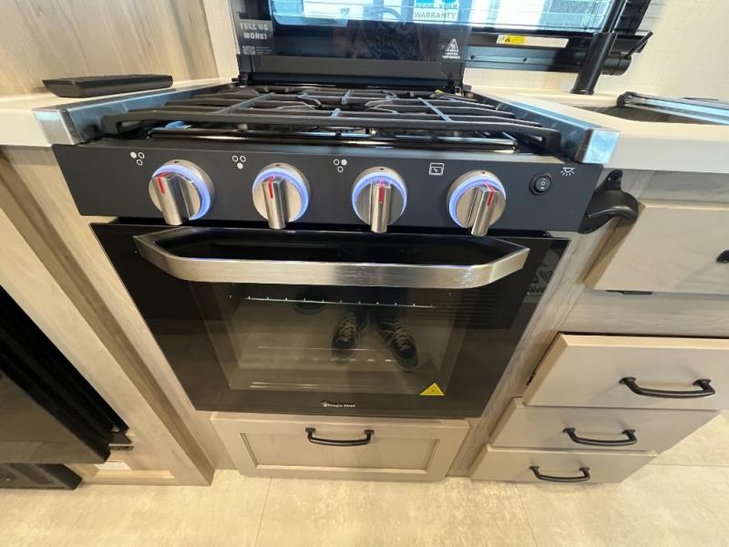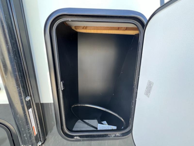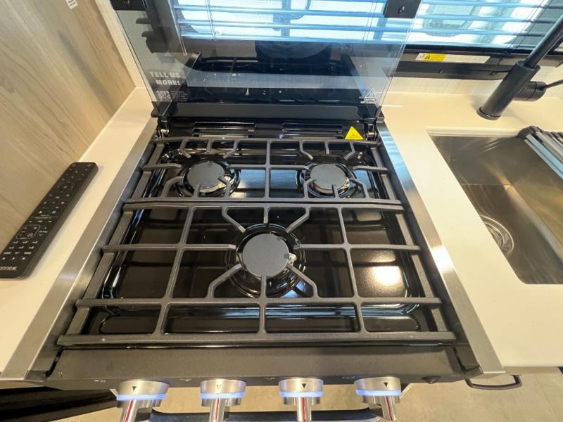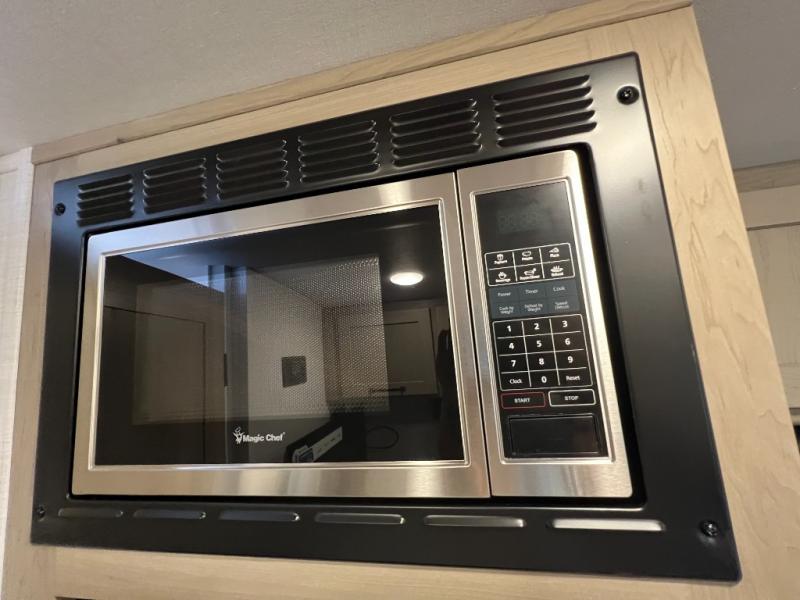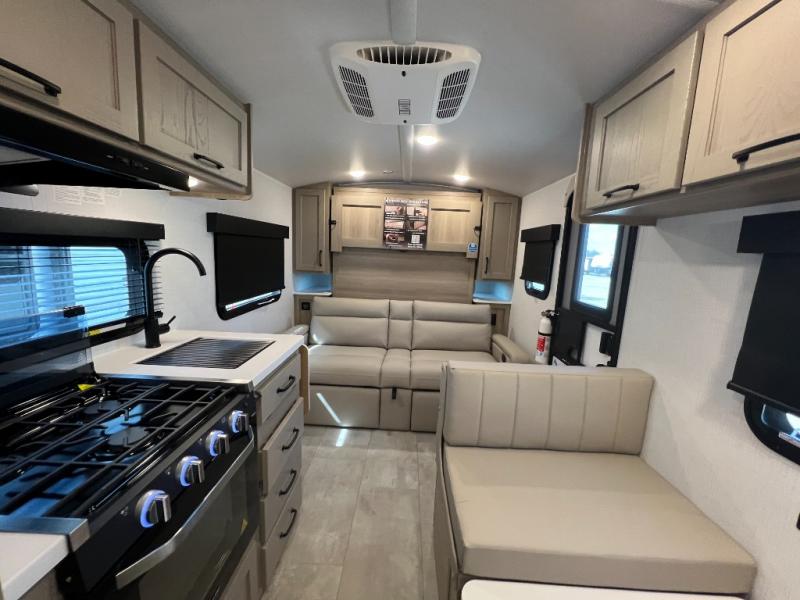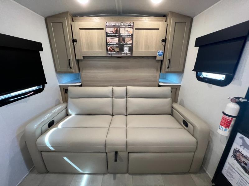 You will love how versatile this travel trailer is thanks to the Murphy bed up front. After you've had a great night's rest, just fold it up to relax on the 72" sofa. This will give the chef more space in the morning to prepare breakfast on the three burner cooktop or in the microwave oven. There is a 32" booth dinette to dine at, or you may just want to take your plate outdoors under the 14' power awning. The full rear bath includes a large linen closet to store clean towels and there is a Showermiser Water Saver you are sure to appreciate. You will appreciate a pass-through storage, plus additional exterior storage so you can bring along hiking gear, water tubes, and fishing poles! The optional Power Package available on this model includes three 200W solar panels, an 11,000 BTU Coleman Mach soft start A/C, two smart remotes, and more off-grid features!
