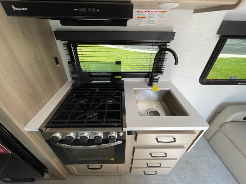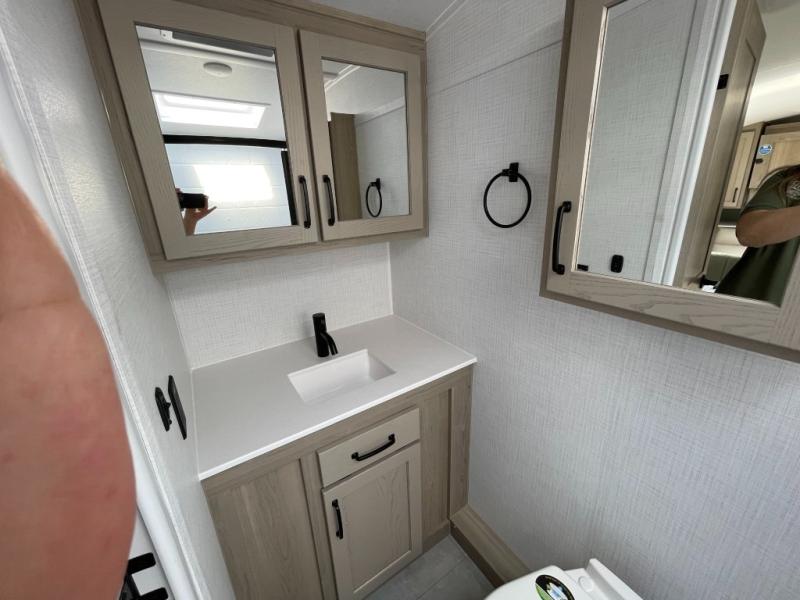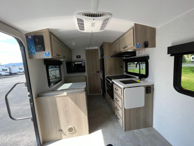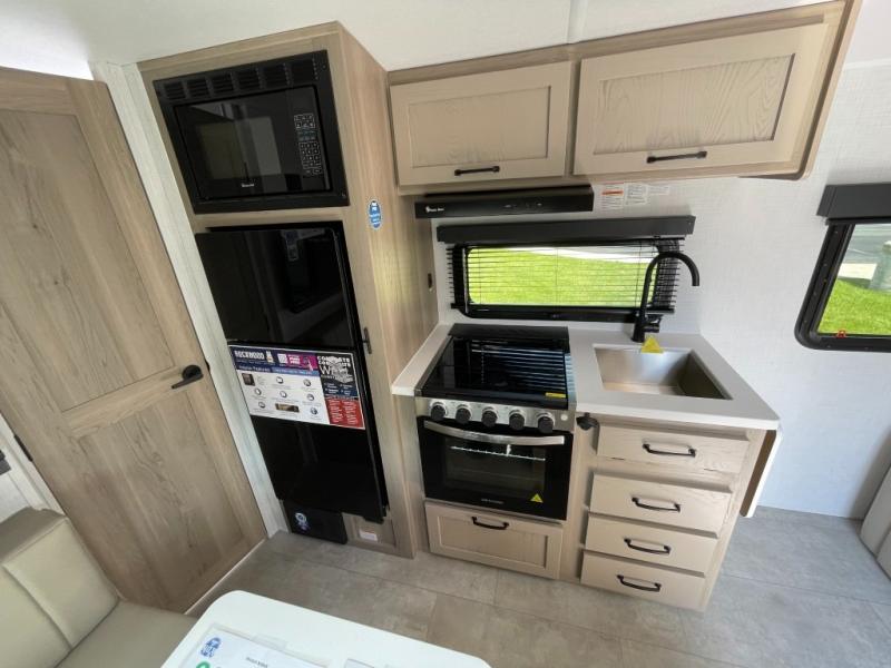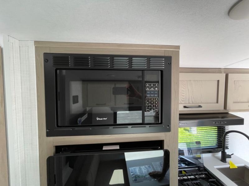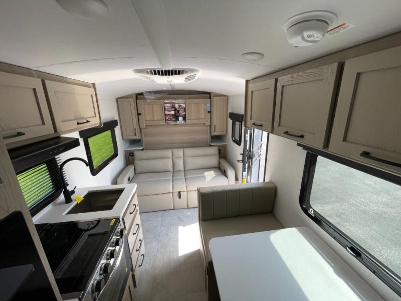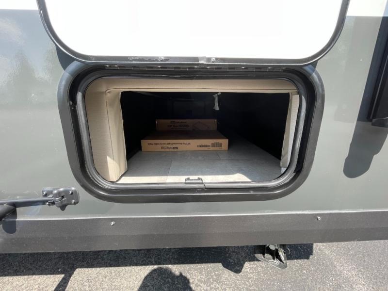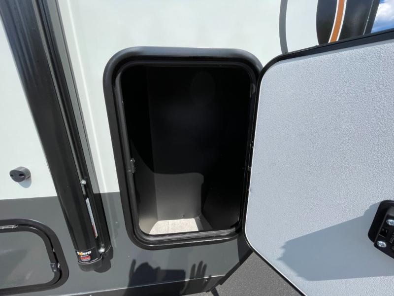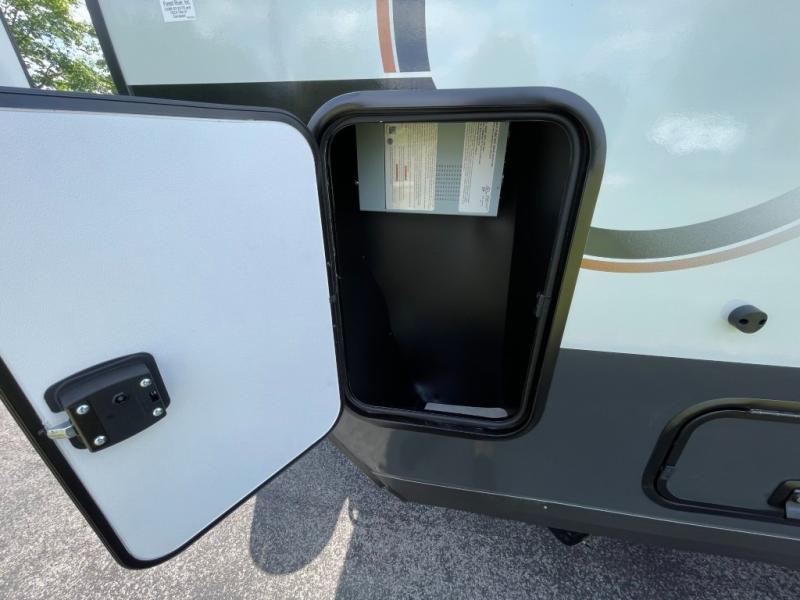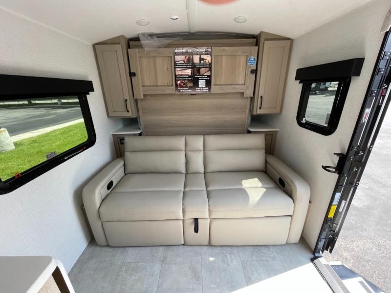 You will love how versatile this travel trailer is thanks to the Murphy bed up front. After you've had a great night's rest, just fold it up to relax on the 72" sofa. This will give the chef more space in the morning to prepare breakfast on the three burner cooktop or in the microwave oven. There is a 32" booth dinette to dine at, or you may just want to take your plate outdoors under the 14' power awning. The full rear bath includes a large linen closet to store clean towels and there is a Showermiser Water Saver you are sure to appreciate. You will appreciate a pass-through storage, plus additional exterior storage so you can bring along hiking gear, water tubes, and fishing poles! The optional Power Package available on this model includes three 200W solar panels, an 11,000 BTU Coleman Mach soft start A/C, two smart remotes, and more off-grid features!