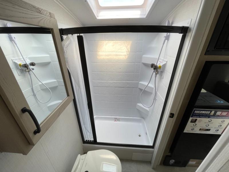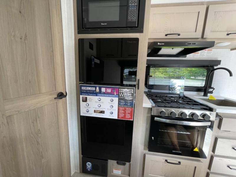 With any Rockwood GEO Pro travel trailer by Forest River you will enjoy easy towing, durable construction, and off-road capabilities with larger 15" tires and a lift kit! Each model is constructed with complete composite wall construction for added strength and durability, and the torsion axle, Rubber-Ryde suspension will make towing easier than ever. Inside, you'll find sleek roller shades for added privacy, a 12V refrigerator and a microwave, plus a 20,000 BTU furnace to keep you warm during the colder camping months.
