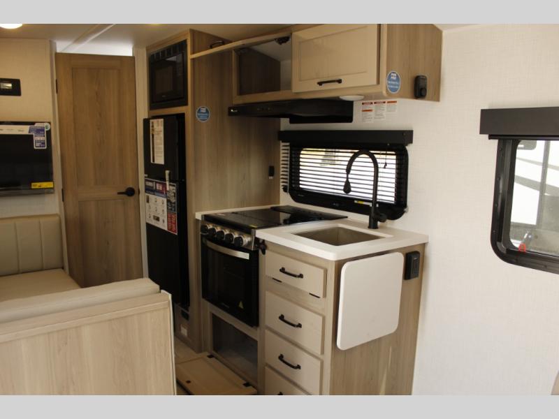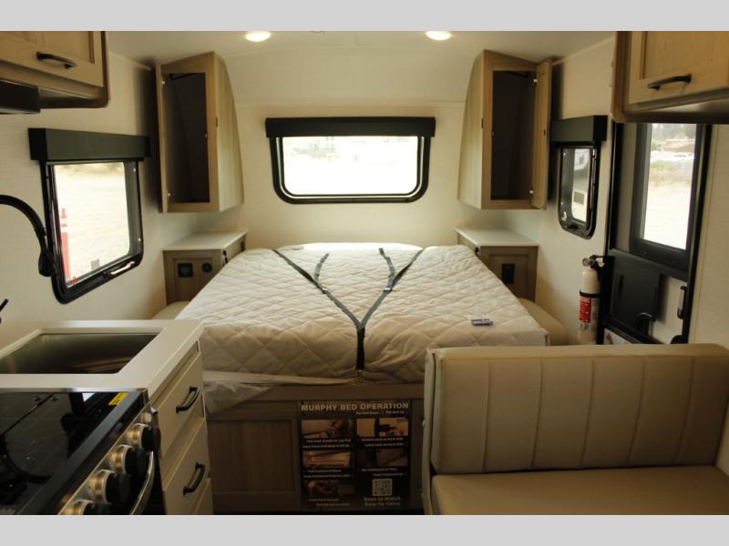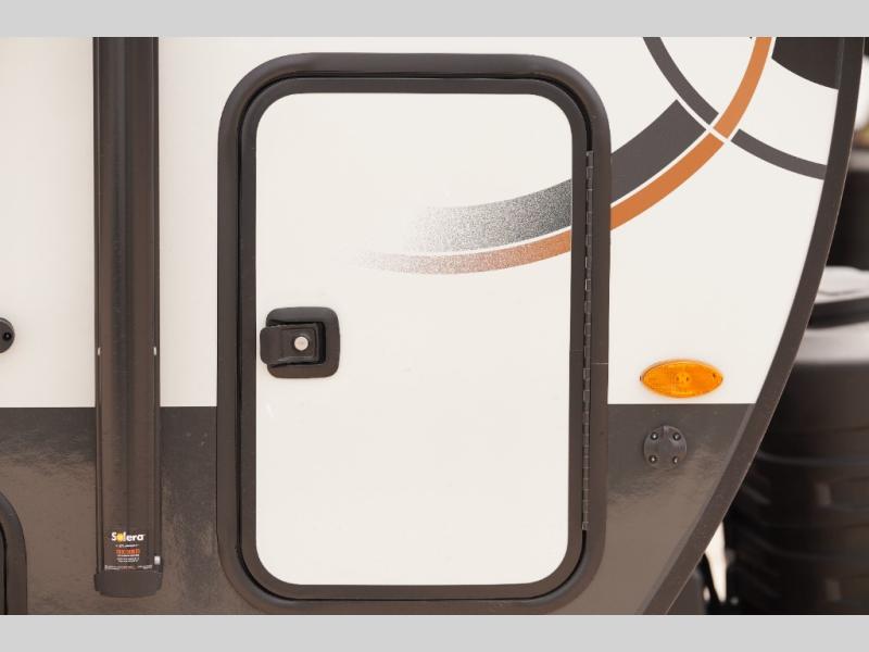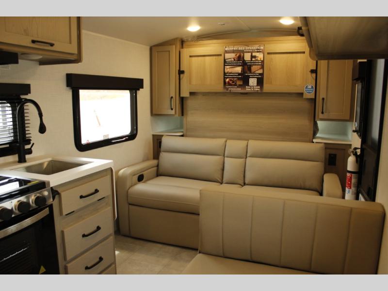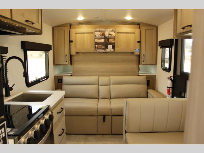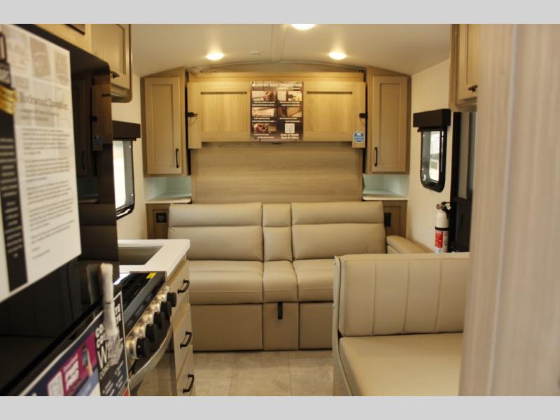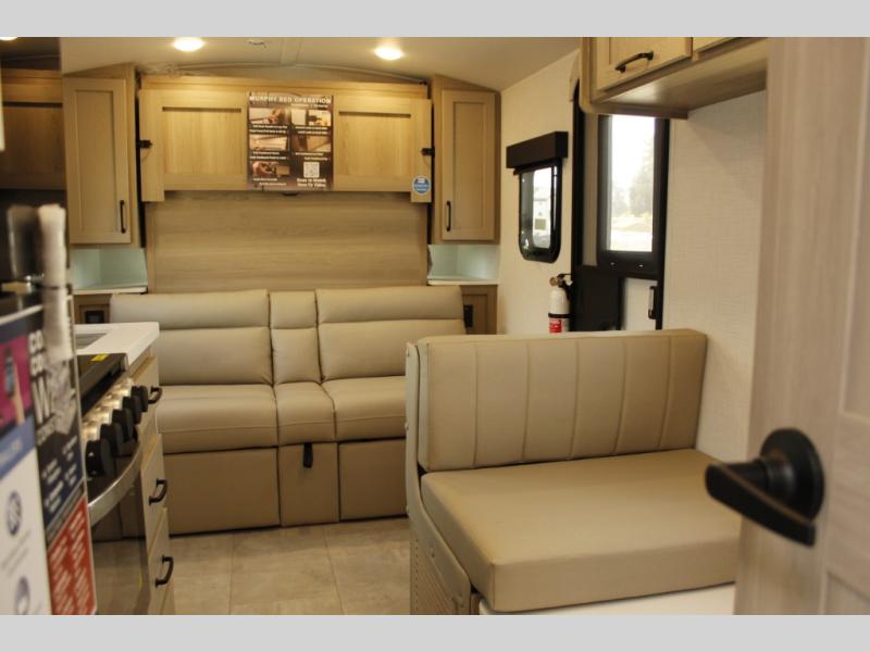 You will love how versatile this travel trailer is thanks to the Murphy bed up front. After you've had a great night's rest, just fold it up to relax on the 72" sofa. This will give the chef more space in the morning to prepare breakfast on the three burner cooktop or in the microwave oven. There is a 32" booth dinette to dine at, or you may just want to take your plate outdoors under the 14' power awning. The full rear bath includes a large linen closet to store clean towels and there is a Showermiser Water Saver you are sure to appreciate. You will appreciate a pass-through storage, plus additional exterior storage so you can bring along hiking gear, water tubes, and fishing poles! The optional Power Package available on this model includes three 200W solar panels, an 11,000 BTU Coleman Mach soft start A/C, two smart remotes, and more off-grid features!