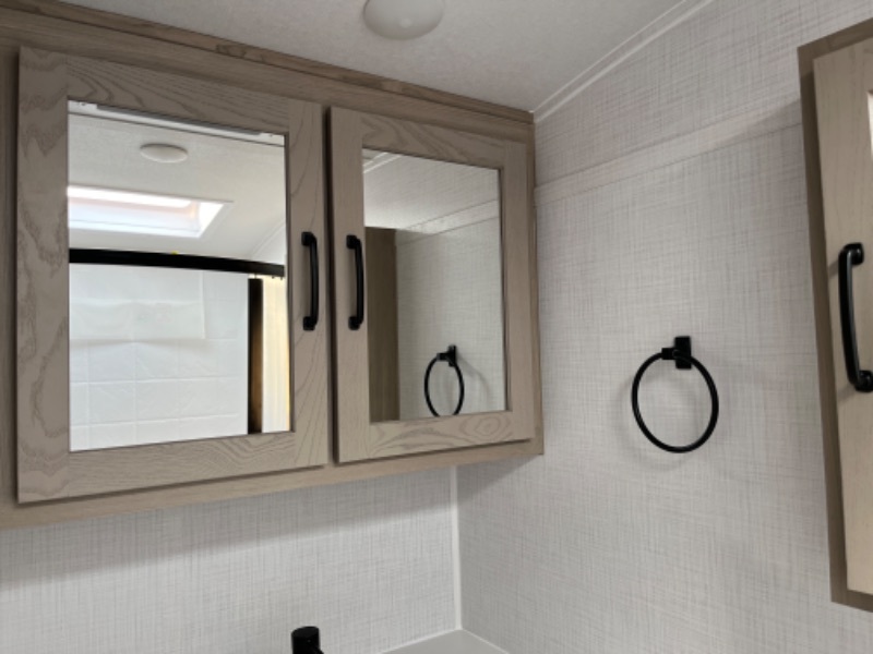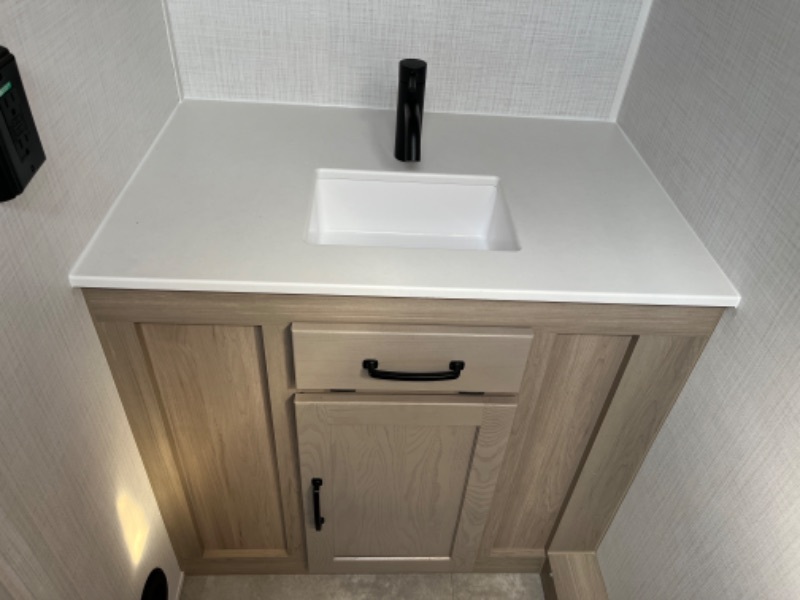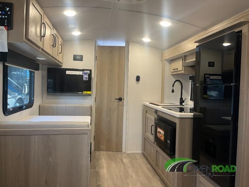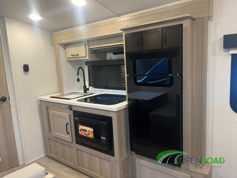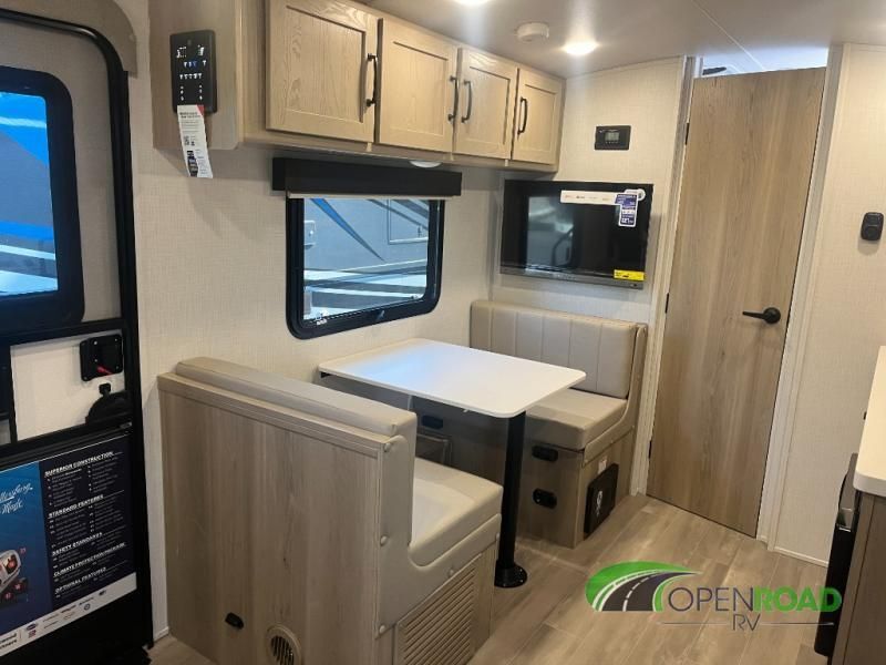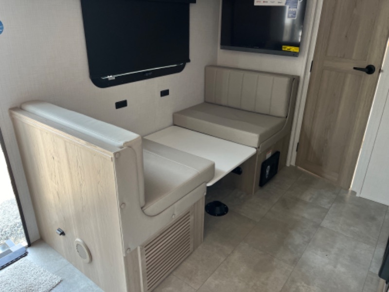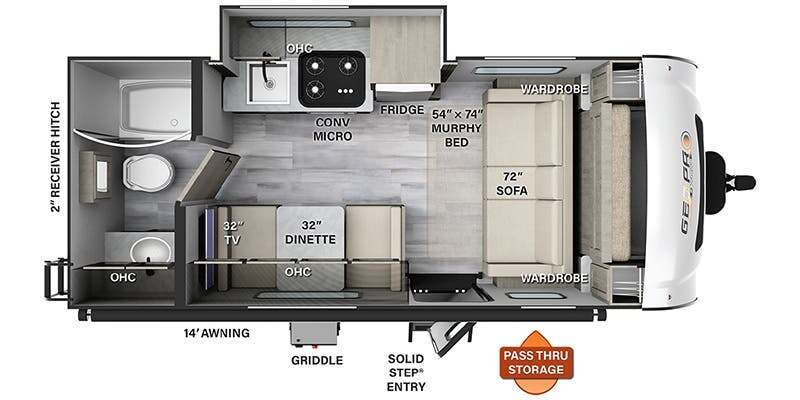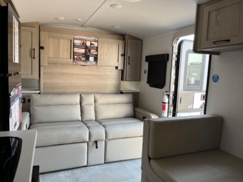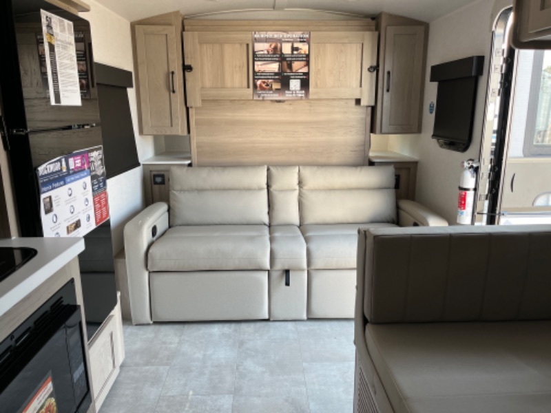 Comfortable sleeping space, convenient seating space, and a full rear bath makes this couple's trailer the one! You will love being able to relax on the sofa during the day, and sleep on the Murphy bed at night. There is a single slide out that will provide you more space to move around or cook meals, and the full bath includes a large shower so you won't feel cramped. If it's a rainy day you can watch movies on the 32" 12V TV, and if it's nice out, sit under the 14' power awning and cook lunch on the outside griddle. The possibilities are endless with this couple's trailer! The optional Power Package available on this model gives you the option to go off-grid for even longer amounts of time!
