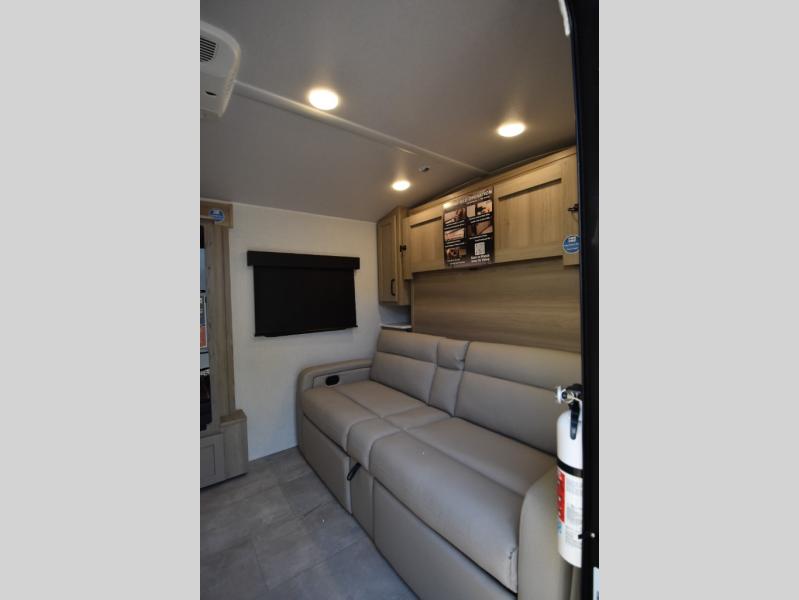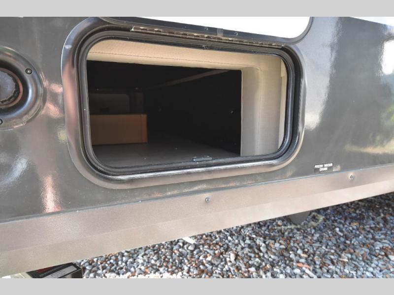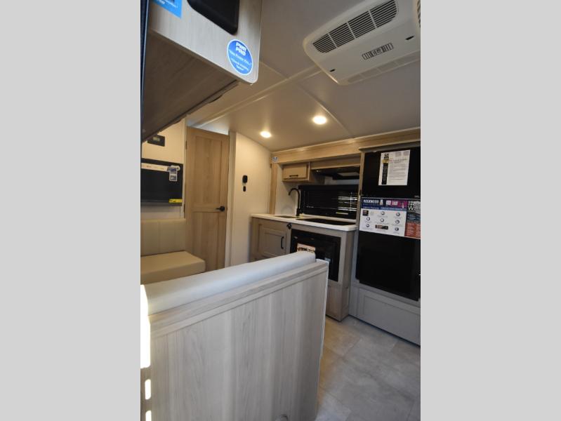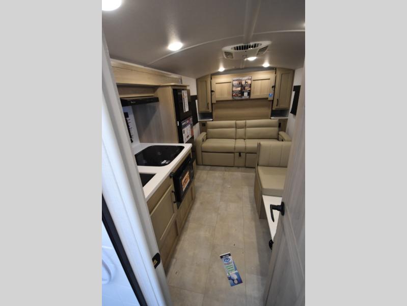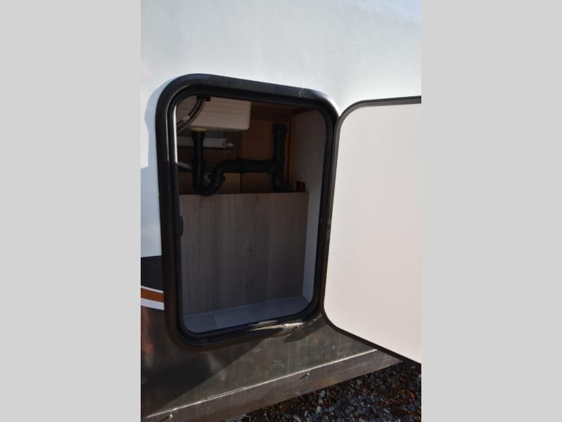 This is the perfect trailer to take on weekend trips to the lake! You'll enjoy a gaucho bed that can convert to your sleeping space at night, and there is a wardrobe to keep your clothes tidy. There is also a shelf here for more storage space! The outside kitchen includes a 12V refrigerator and a convection microwave, plus a griddle to cook meals on.