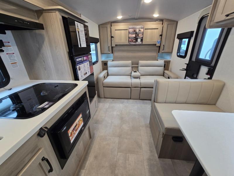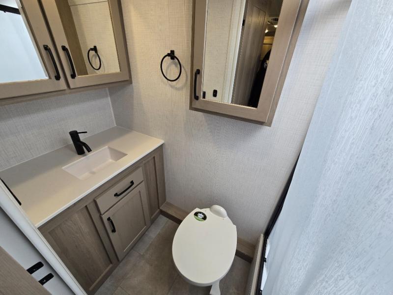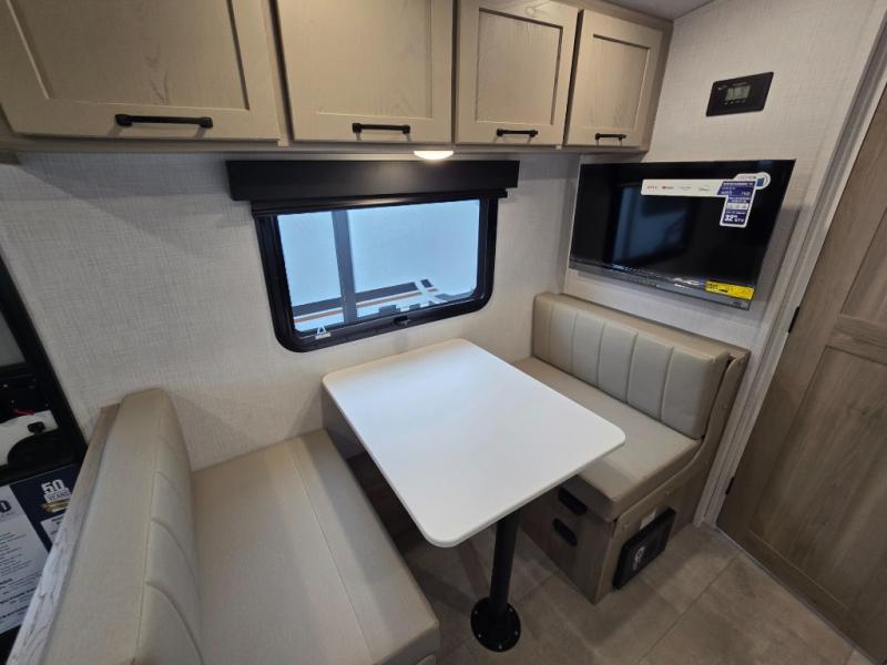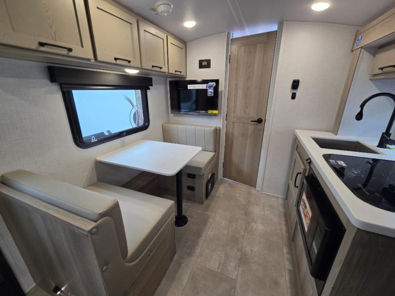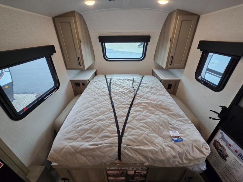 Comfortable sleeping space, convenient seating space, and a full rear bath makes this couple's trailer the one! You will love being able to relax on the sofa during the day, and sleep on the Murphy bed at night. There is a single slide out that will provide you more space to move around or cook meals, and the full bath includes a large shower so you won't feel cramped. If it's a rainy day you can watch movies on the 32" 12V TV, and if it's nice out, sit under the 14' power awning and cook lunch on the outside griddle. The possibilities are endless with this couple's trailer! The optional Power Package available on this model gives you the option to go off-grid for even longer amounts of time!